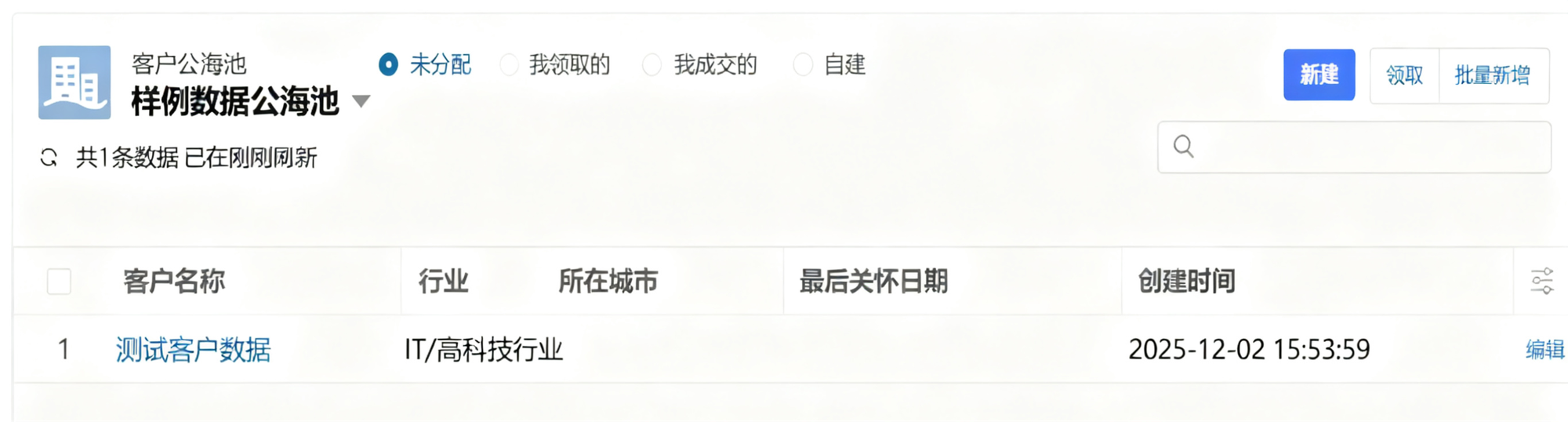 新建记录时,选择记录的所属公海池,便会将记录置入对应公海池。当在公海池内新建记录时,分配状态将保存为“未分配”,所有人将设为对应公海池。若在其他位置新建,所有人为记录的创建人,分配状态会保存为“自建”。