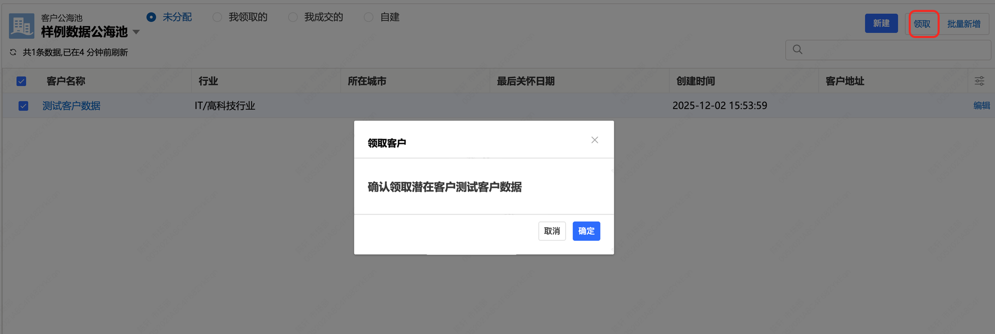 在“未分配”类别中,选择想要跟进的记录并点击领取,便可领取记录。领 取后的记录所有人会变为自己,并且可以在潜在客户对象列表中,或是公海池中 “我领取的”类别下看到对应记录。