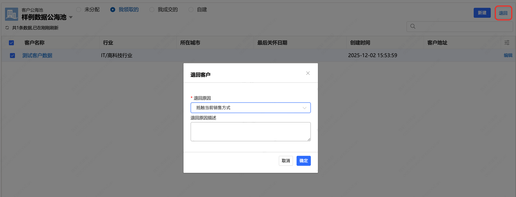 在公海池“我领取的”与“自建”类别下,选择记录并点击“退回”,可以将不想继续跟进的记录退回至公海池,以供他人领取。退回时需填写退回原因。