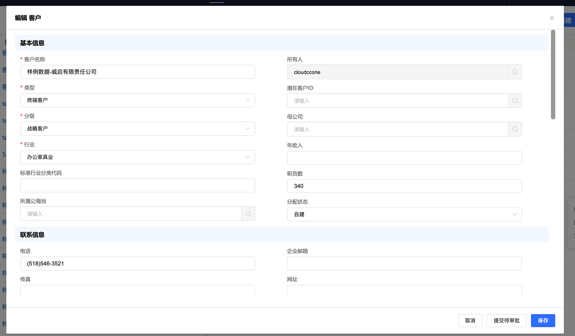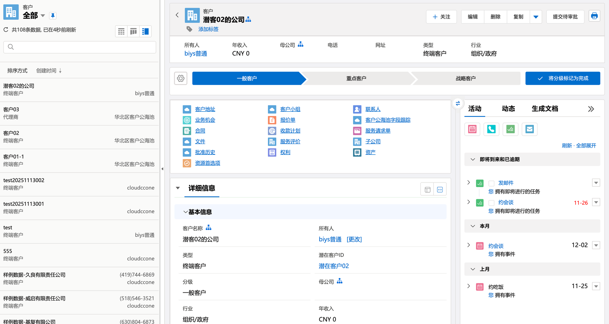 在客户记录的详细信息页面中,可以查看、维护客户的基本信息与相关信息, 并查看与记录销售的日常跟进情况。