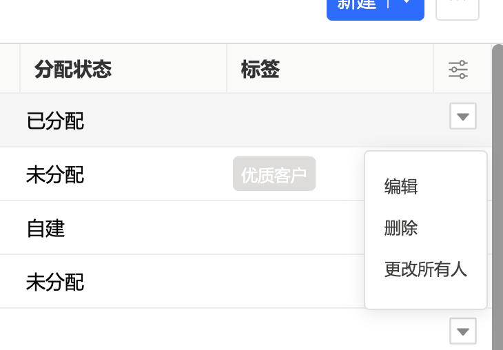 在视图中,根据自己的权限,可以通过视图右上方或每条数据旁边的按钮, 对数据进行添加、编辑、删除、更改数据的所有人。