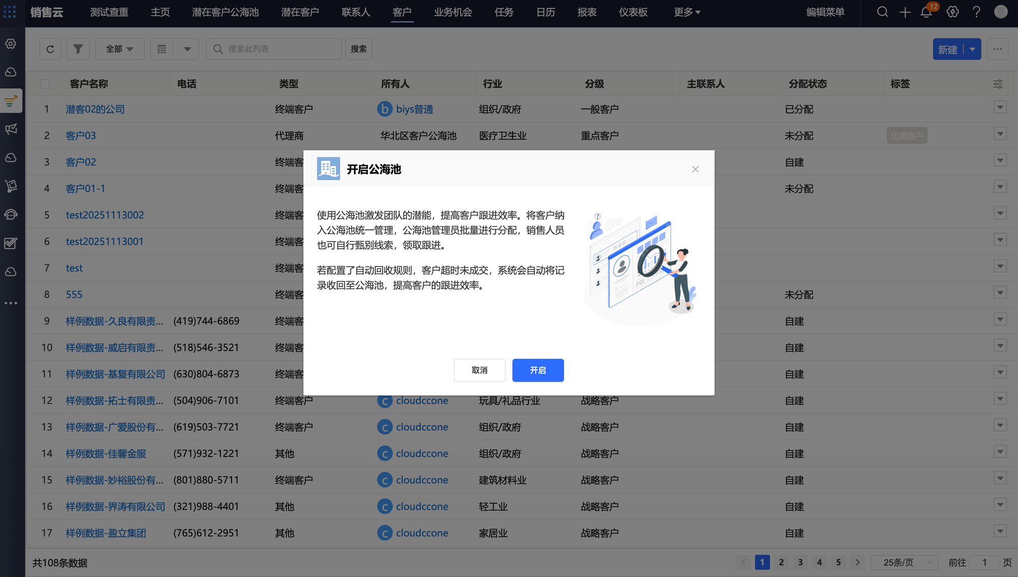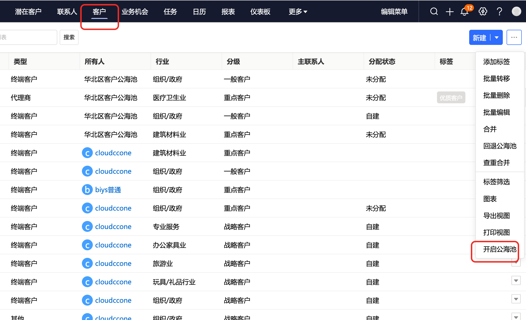 在“客户”菜单列表视图右上角,“更多”按钮中,可以启用潜在客户公海池功能。