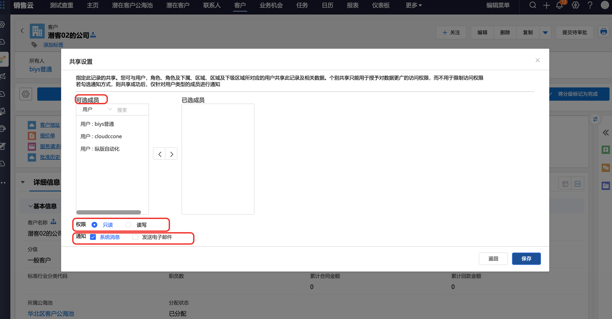 ⑤点击右下角“添加”按钮后弹出弹窗如下,为其他人添加记录的只读/读写权限,协同工作。