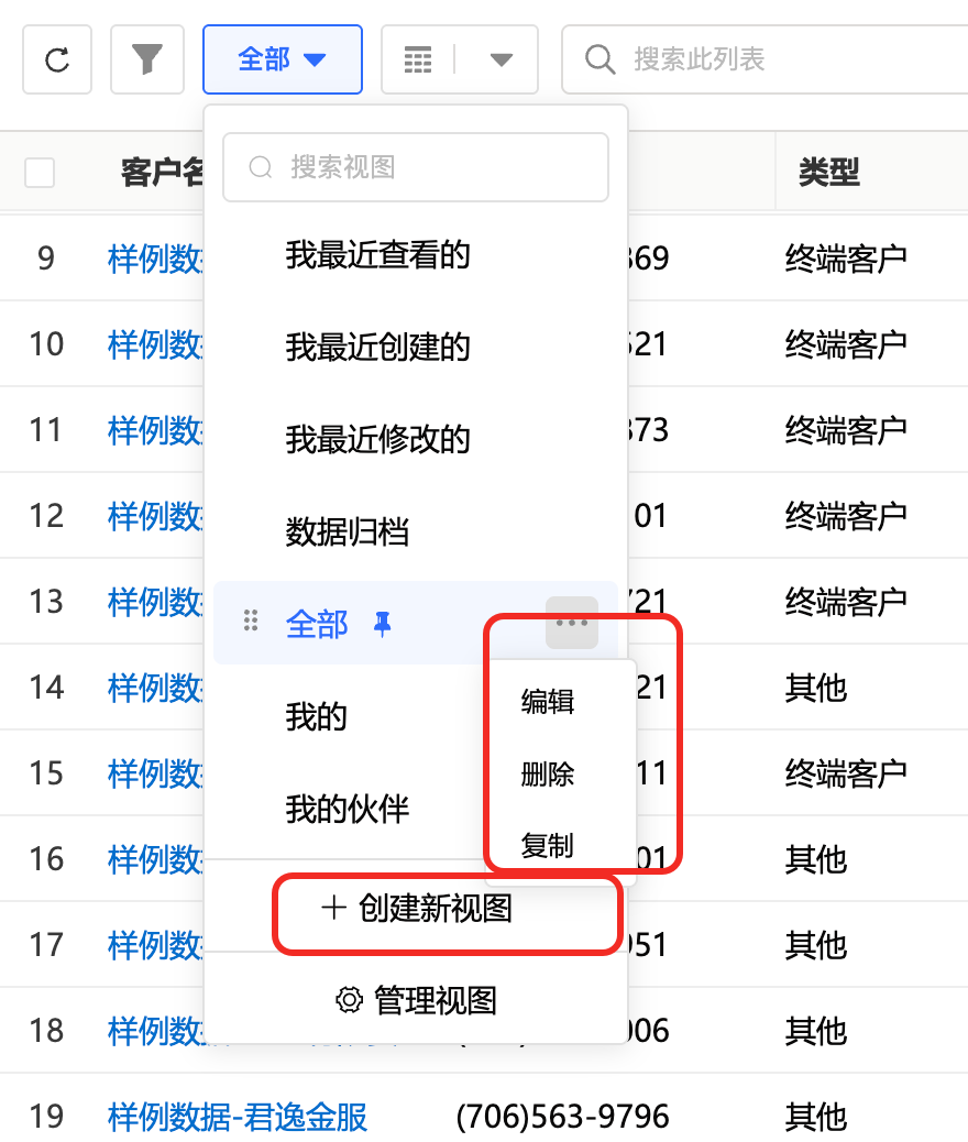 (3)使用列表视图控制菜单来创建、编辑、删除视图,排序拖动顺序即可完成排序。