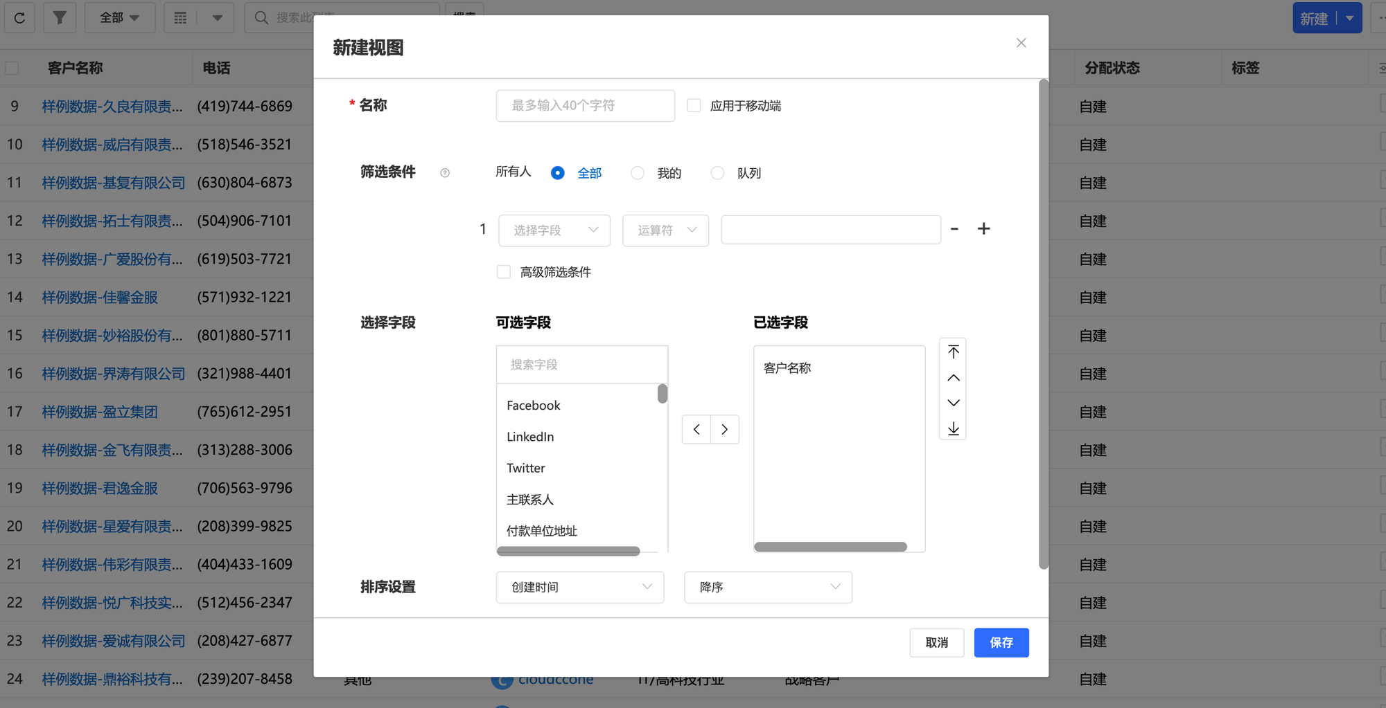(4)另外,点击创建新视图,打开视图创建弹窗,输入名称,设定筛选条件,选择视图显示字 段,设定可见性,“保存”后完成视图的创建。
