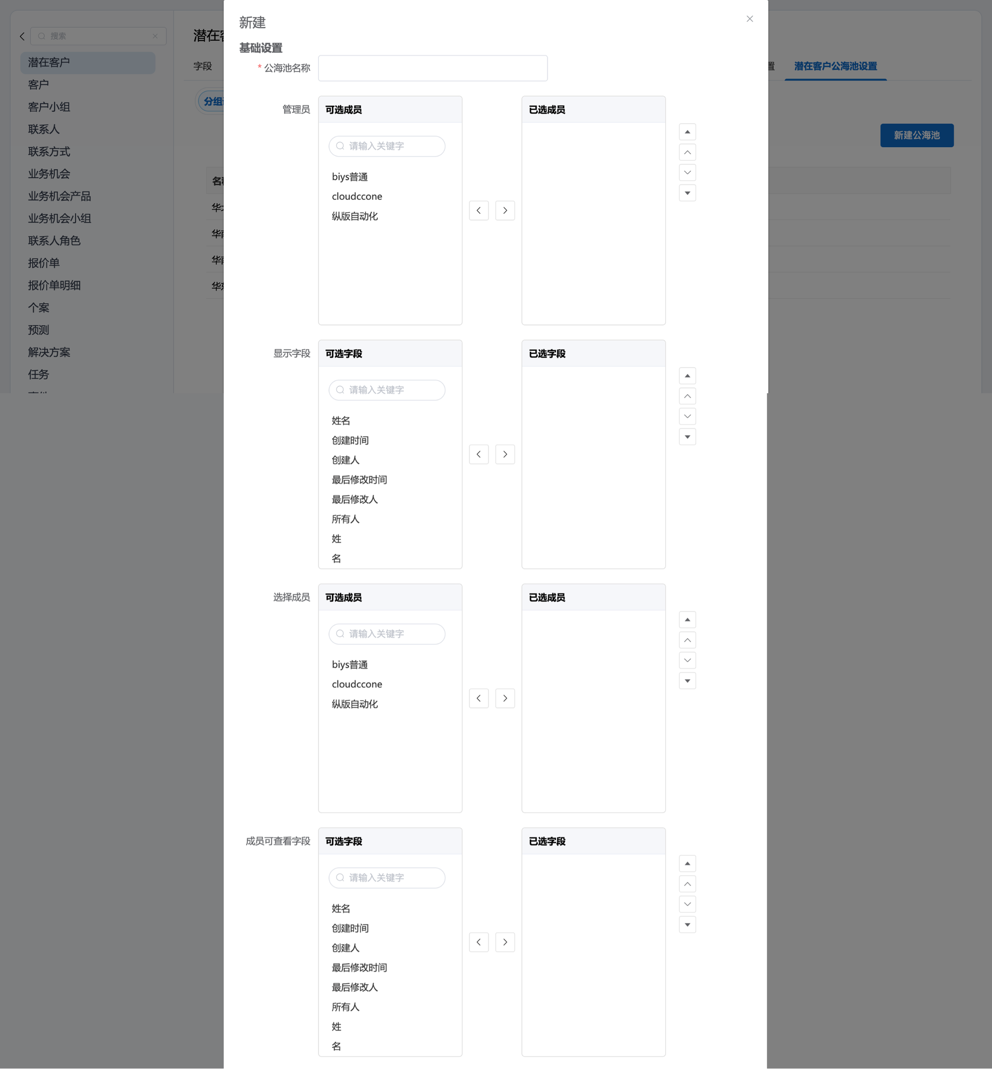 第二步:选择公海池的管理员与成员,并分别设置管理员与成员可以查看的字段。公海池的管理员会拥有公海池内记录的查看权限,并且可以对记录进行分 配、回收、废弃、转移等操作。公海池的成员在未领取记录时,没有记录的查看 权限,只能看到表格中展示的几个字段。