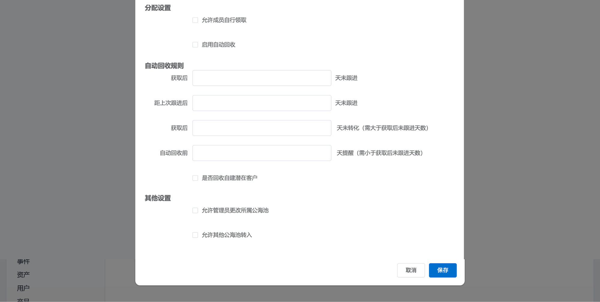 第三步:设置公海池的自动回收规则。不同条件之间为“或”的关系。系统会根据设置的规则,自动将符合条件的记录回收至公海池,状态重新变为未分配, 以供其他成员查看与领取。同时也可进行其他设置,如是否启用自动回收、是否 允许成员自行领取记录、是否允许公海池管理员将记录转出/转入等。点击保存, 完成配置。