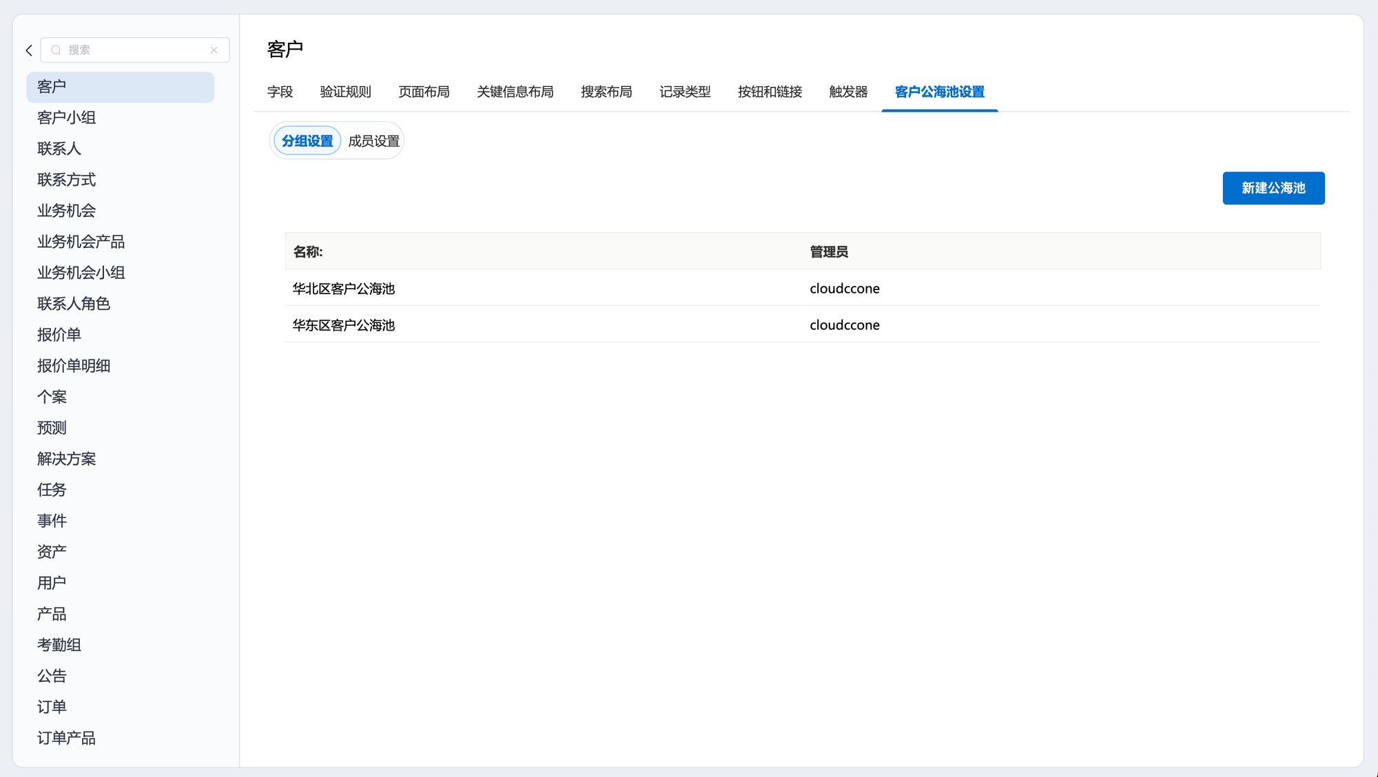 第一步:进入后台设置-定制-标准对象,点击“客户”对象,切换到“客户公海池设置”菜单,点击“新建公海池”,创建一个客户公海池。