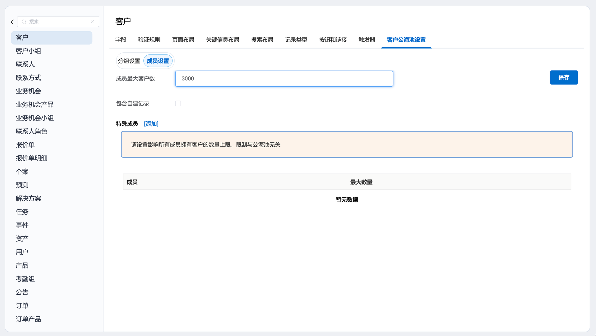 点击客户公海池设置中的成员设置,可限制成员持有公海池记录的数量。输入成员最大记录数,当成员拥有过多处于公海池中且未转换的潜在客户时,将限制该成员继续领取记录,从而防止恶性竞争。可以选择是否将成员自建的记录 也算作在内。该设置会统一影响全部用户,且只会区分记录是否在公海池中,不 会区分不同公海池。
