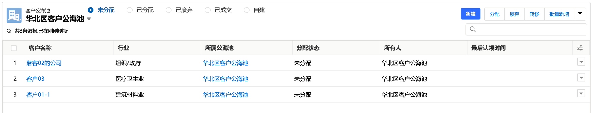 若为公海池管理员,可以进入对应公海池进行分配、回收、废弃、转移等操作。