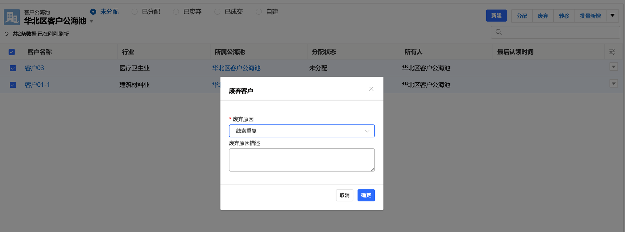 对于未分配的记录,可以选择记录并进行废弃。废弃时需要填写废弃原因。废弃后的记录会单独存在于“已废弃”类别中,公海池成员不可见。