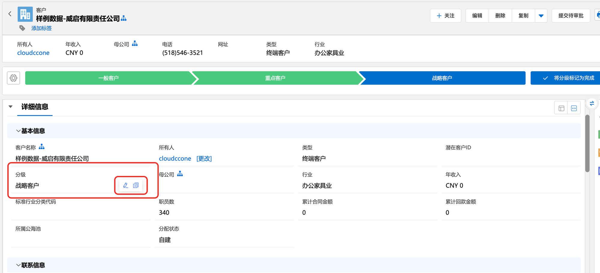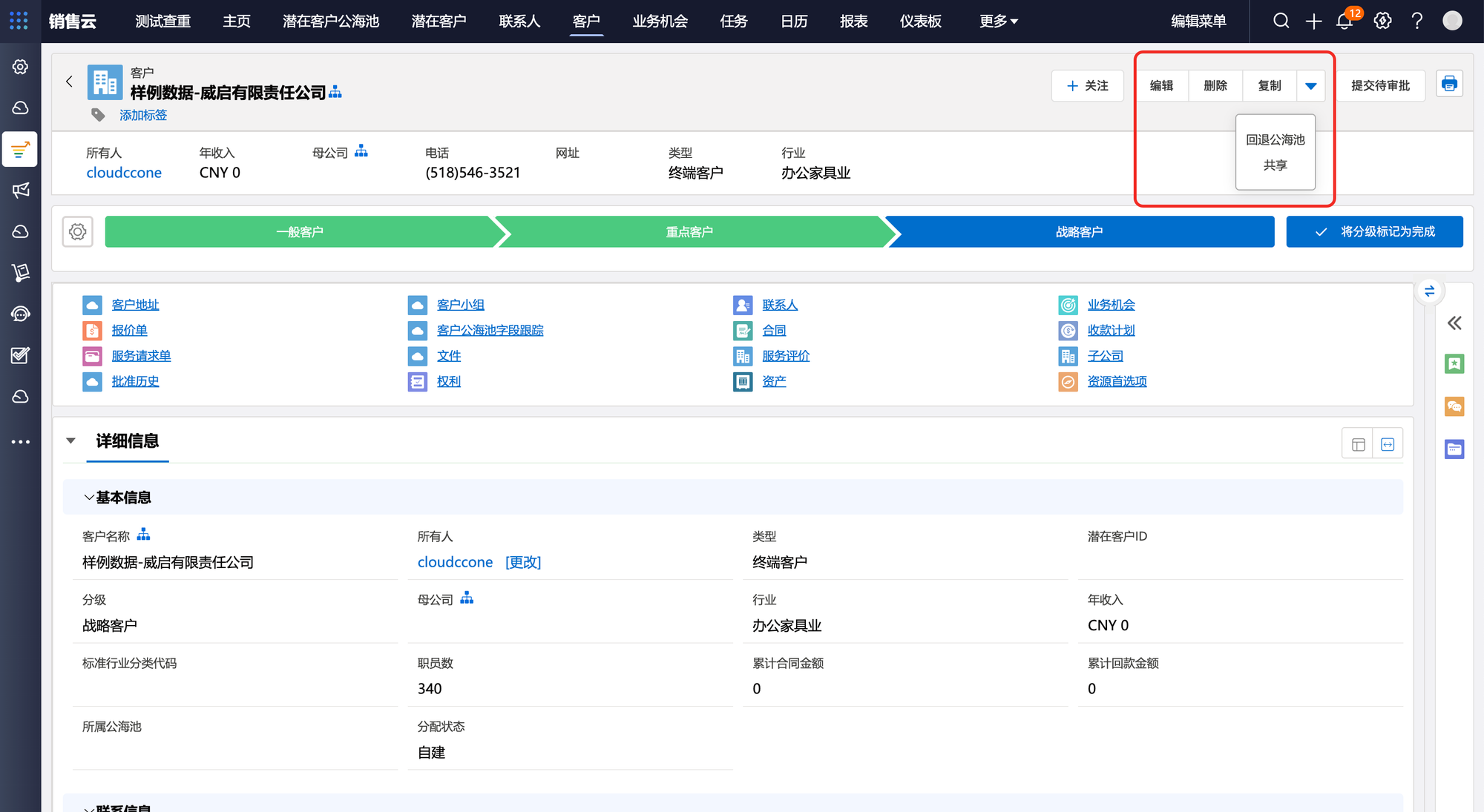 ①可在详细信息中查看、编辑、复制基本信息。同时可以在记录右上角对数据进行编辑、 复制、删除数据,更改记录的所有人,或者为他人共享数据权限等。
