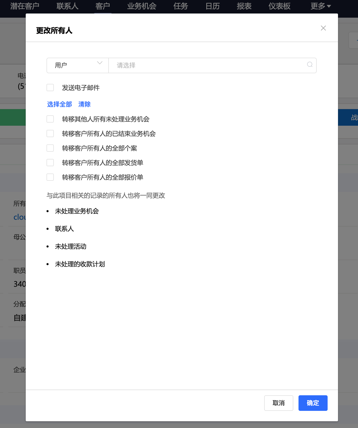 ③点击所有人字段旁的“更改”(需具有对应权限),可以更改记录所有人。