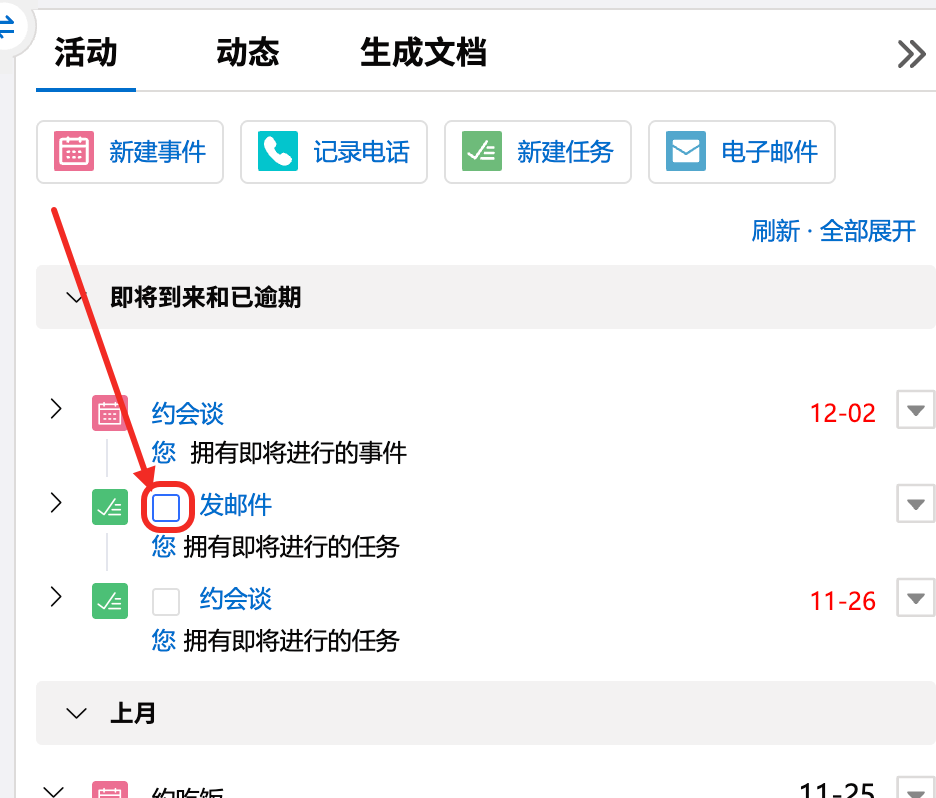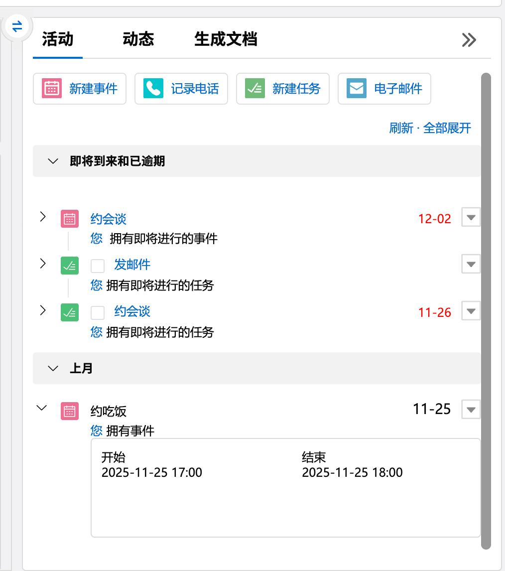 活动时间轴上显示了当前记录下所有未完成的活动。逾期未完成的任务和即将到来的任务事件会在活动时间轴中"逾期和即将到来"模块中显示。过去或当 前已结束的任务、事件、记录的电话、邮件、短信会在相应的月份中显示。