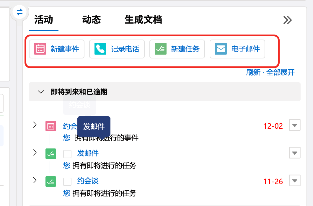 同时,动态中会展示记录中创建的活动、发送的邮件,或是某些关键字段的更新。