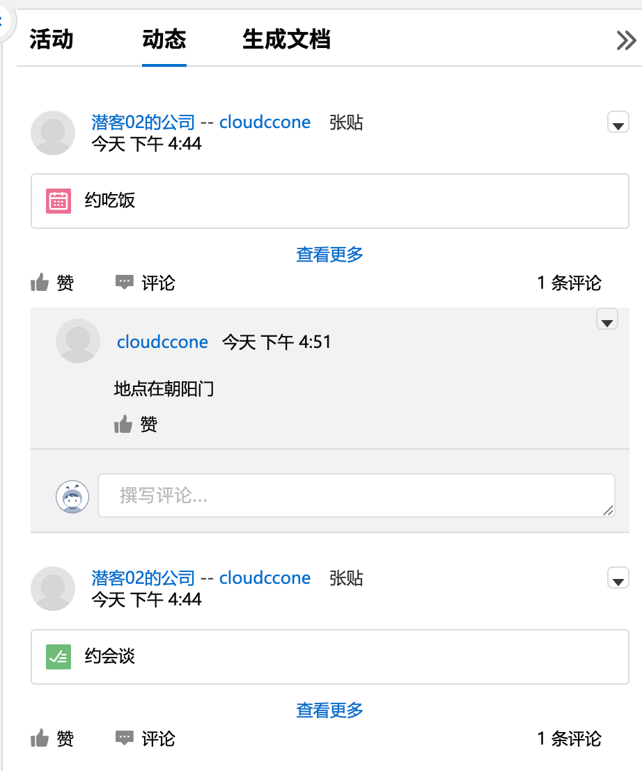 在详细信息中使用动态功能,查看团队对记录的全部跟进动作,并可以在动态中进行讨论,协同跟进。