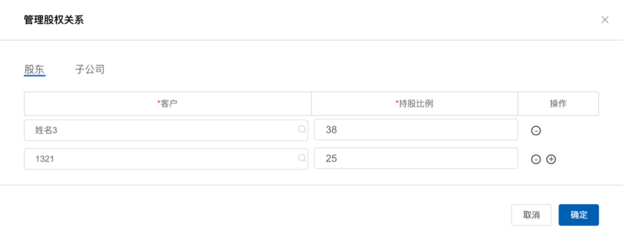 点击“管理股权关系”,可以维护客户的子母公司信息。
