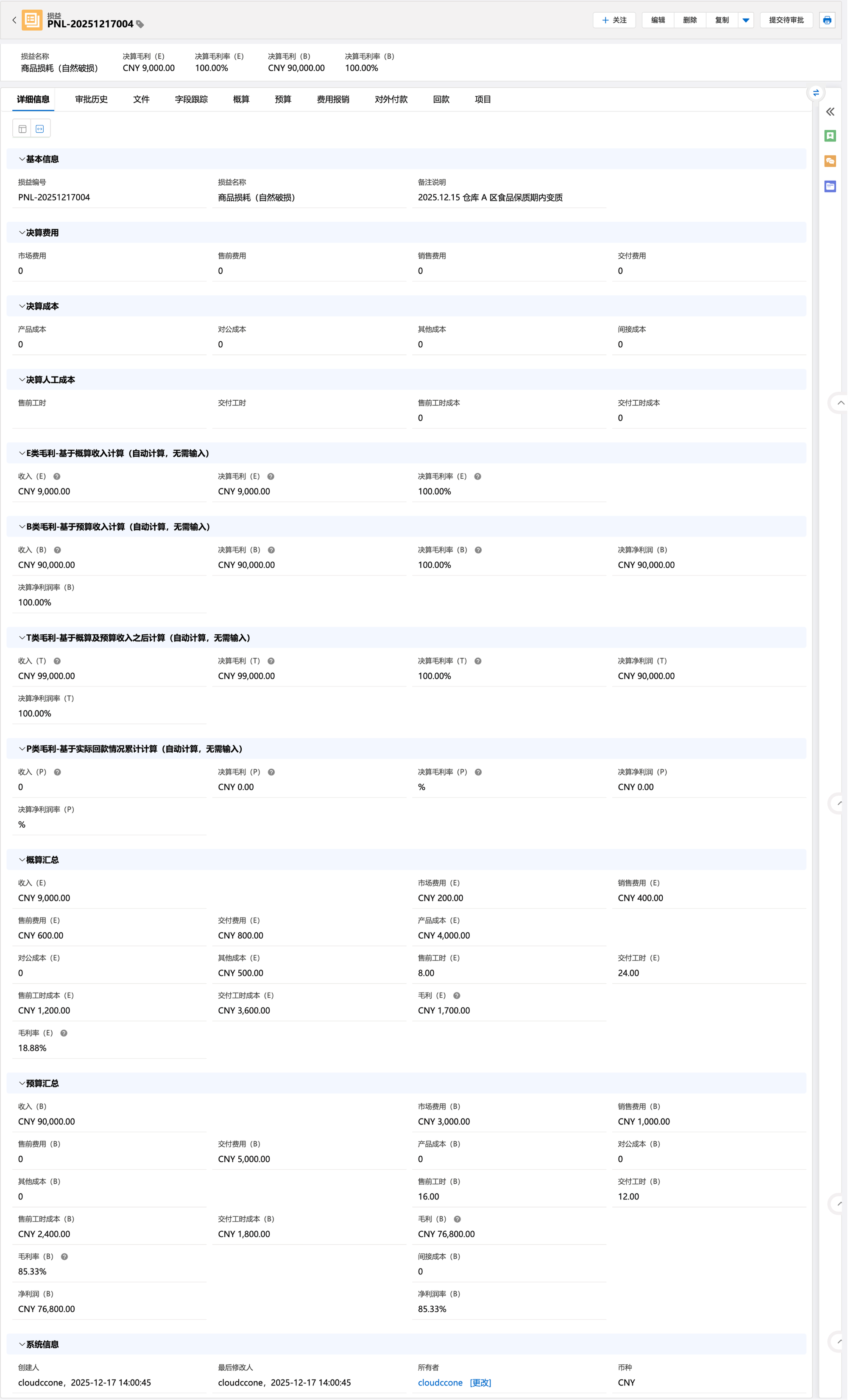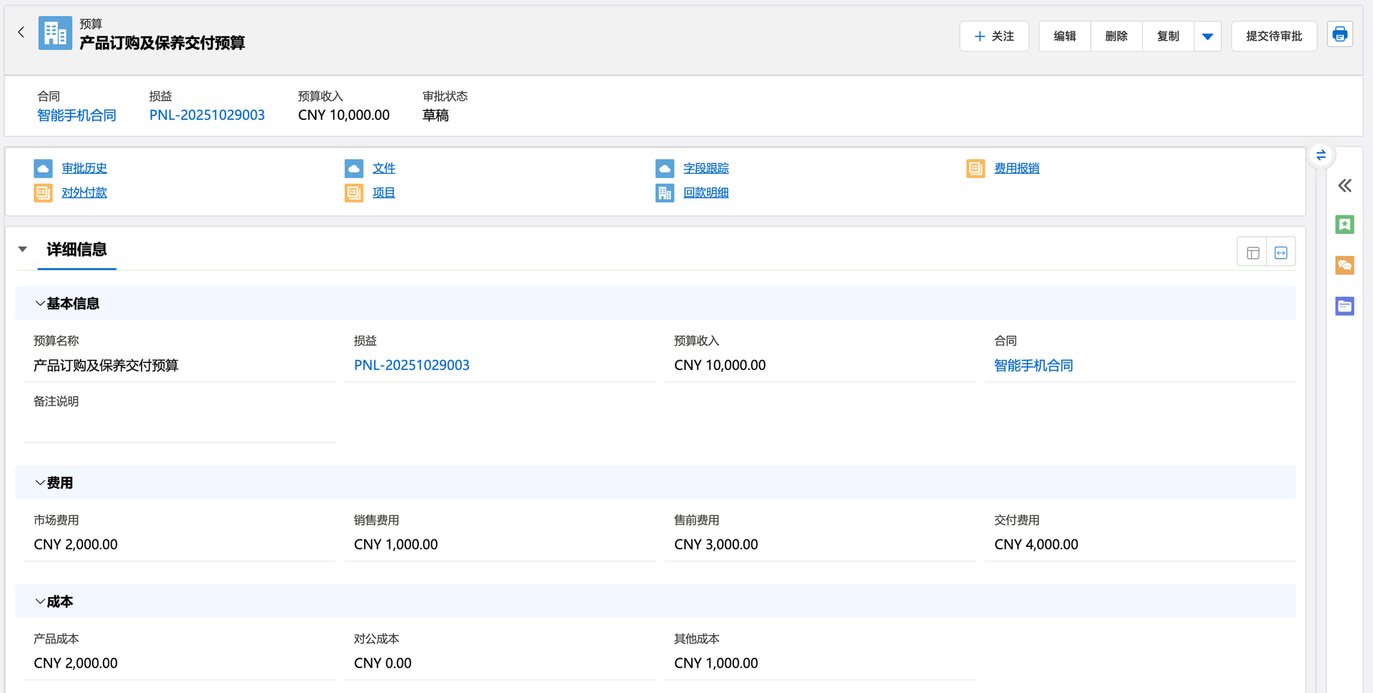 相关用户可以在合同记录下录入预算信息,预算金额、费用、成本、人工工时成本等,预算审批通过后这些预算信息可以自动汇总记录到合同关联的损益上。当然,一条商机赢单后, 可以与客户签订多条合同,这些合同的预算都可以汇总到同一条损益上。