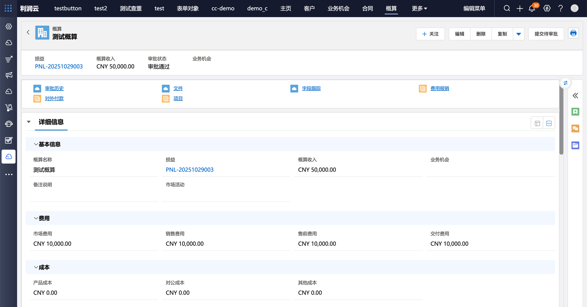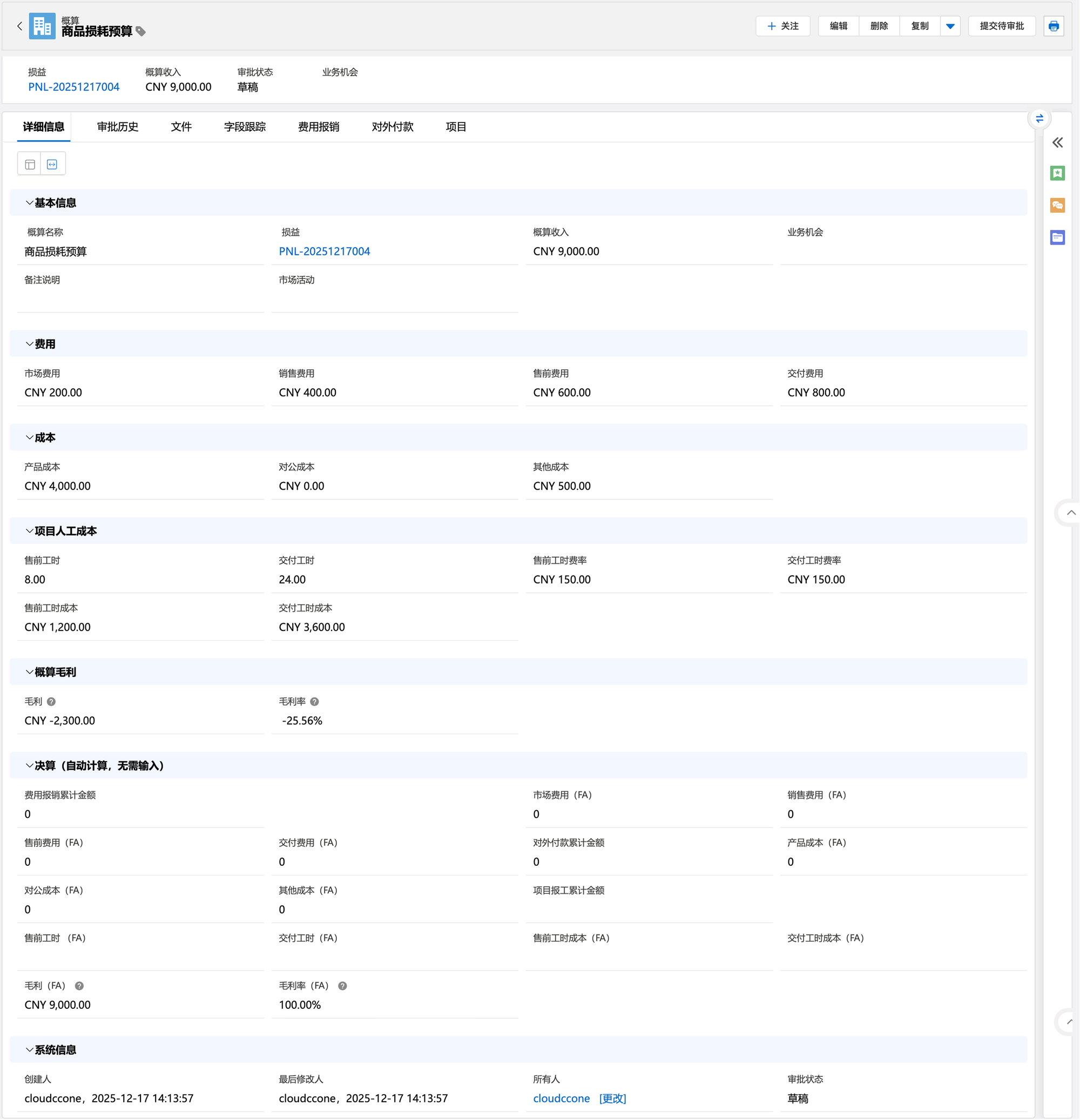 销售商机一旦立项,销售人员就要在商机下录入概算信息,商机下的所有审批通过的概算费用及成本会汇总到损益上。用来圈定成本花费的范围,保证利润。