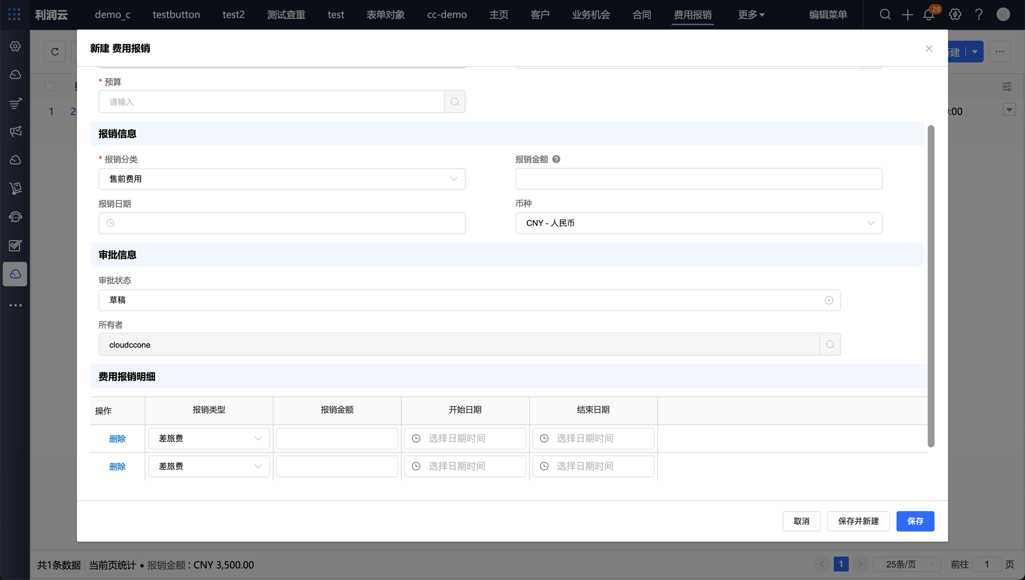 主要为新建费用报销