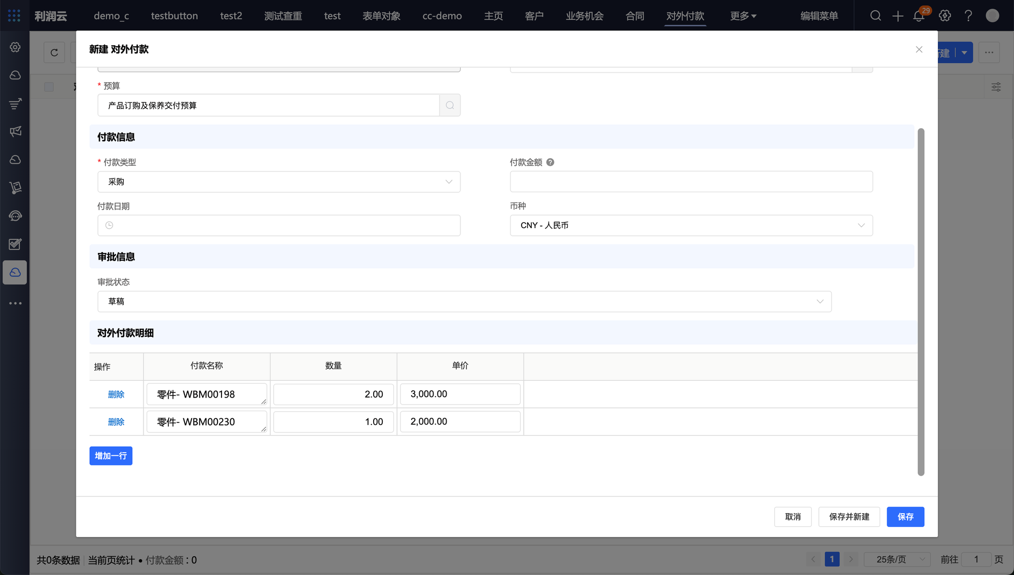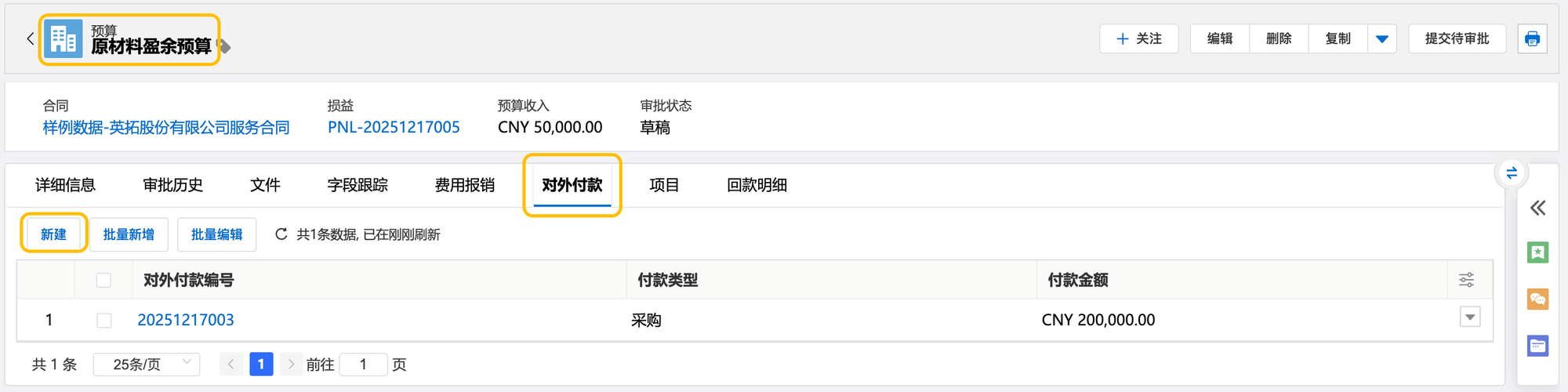 b)预算详情页,定位至对外付款相关列表,点击新建。