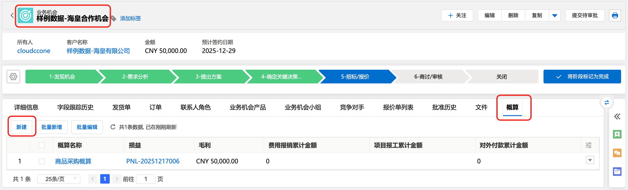 1. 业务机会详情页,定位到概算相关列表,点击新建按钮