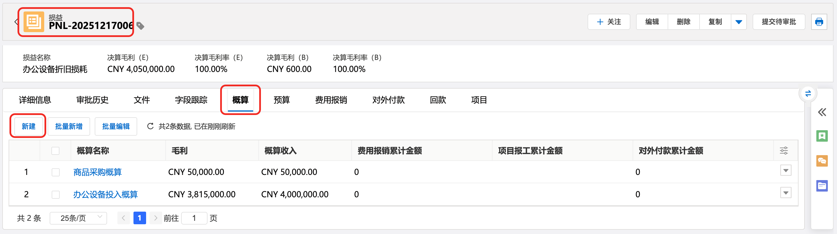 2:损益详情页,定位至概算相关列表,点击新建