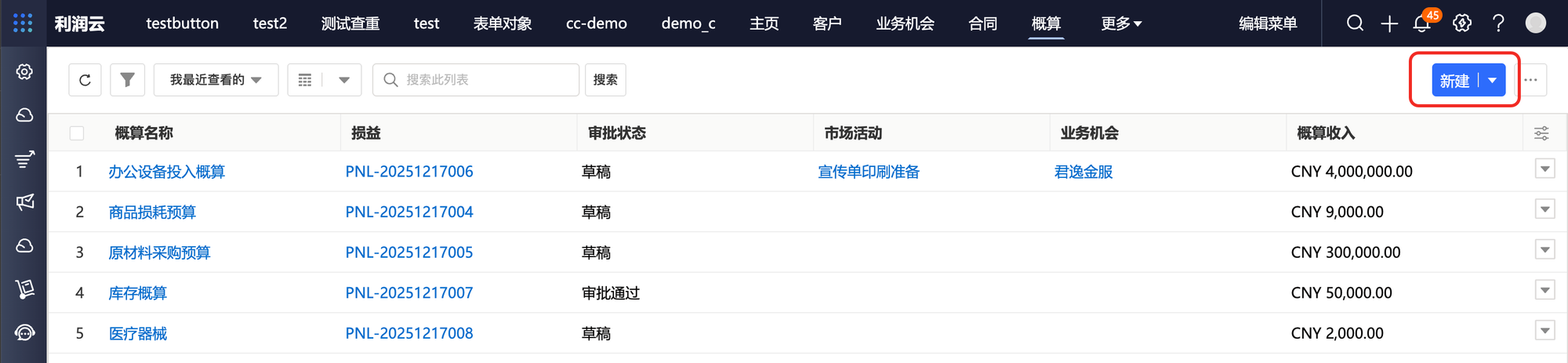 3. 概算列表视图,点击新建按钮