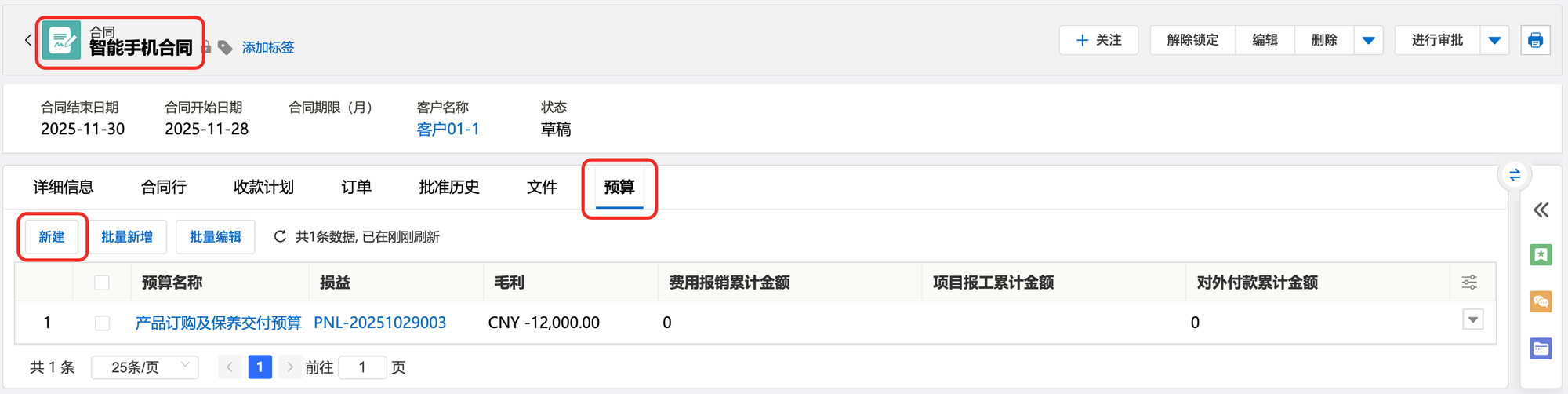 1:合同详情页,定位到预算相关列表,点击新建按钮。