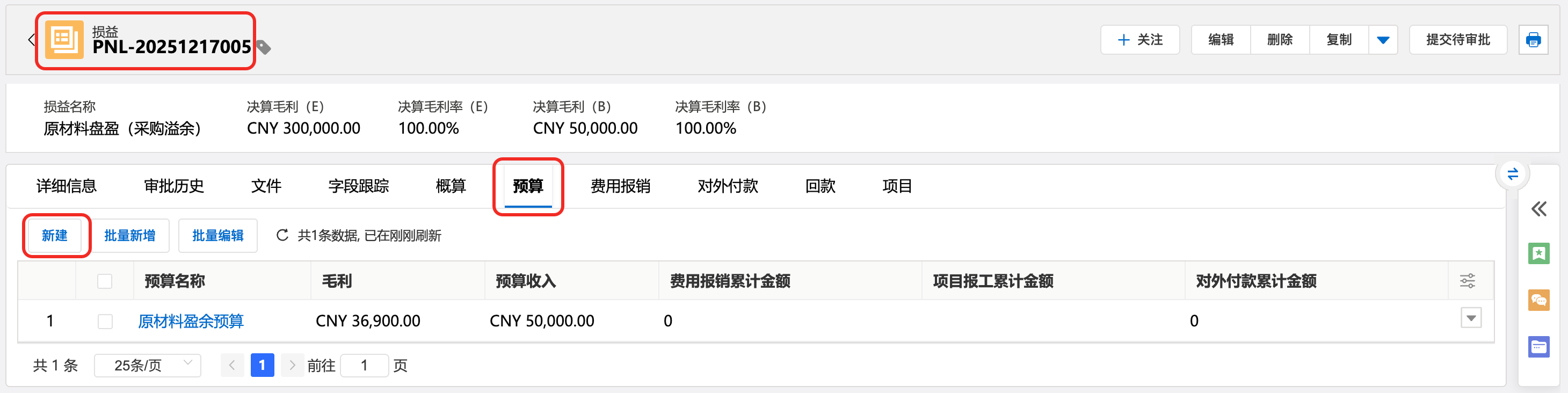 2:损益详情页,定位至预算相关列表,点击新建。