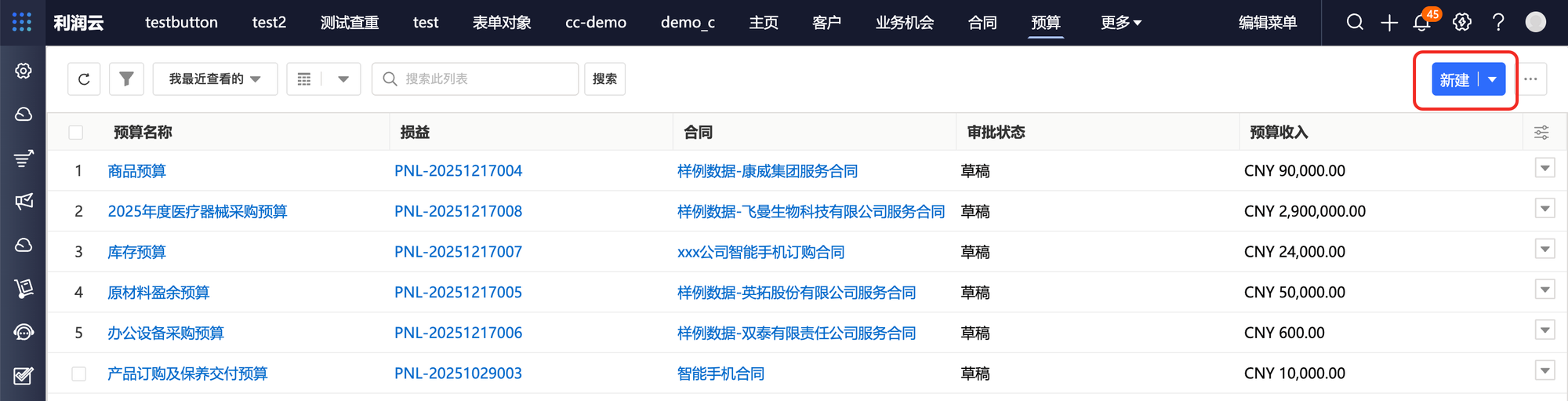 3. 预算列表视图,点击新建按钮。