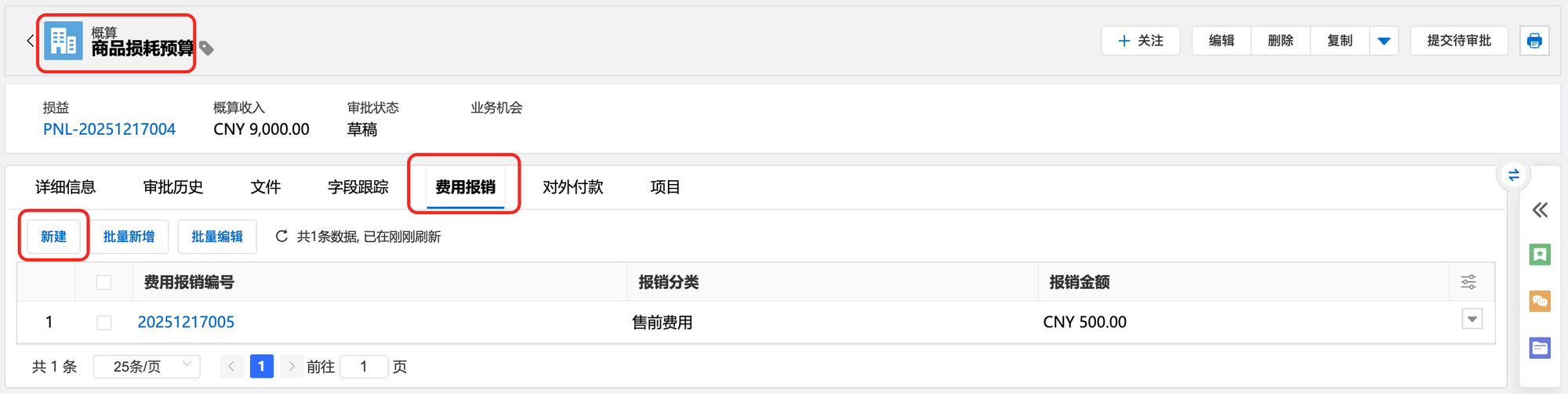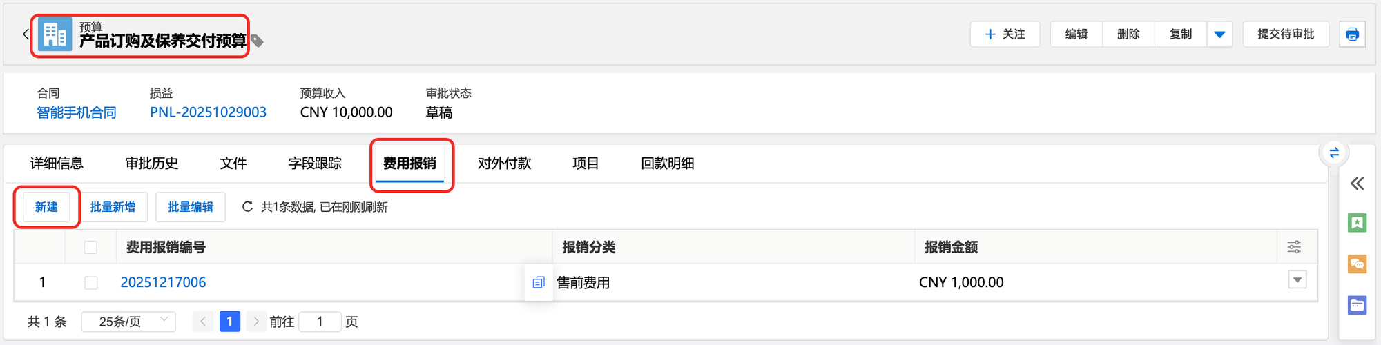 b)预算详情页,定位至费用报销相关列表,点击新建。