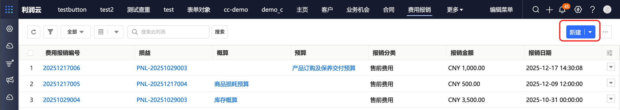c)费用报销列表页,点击新建。