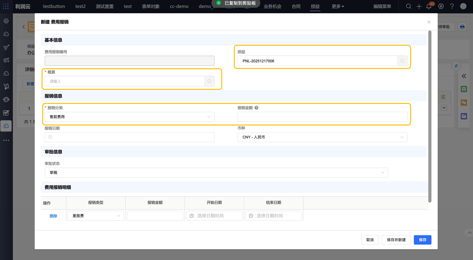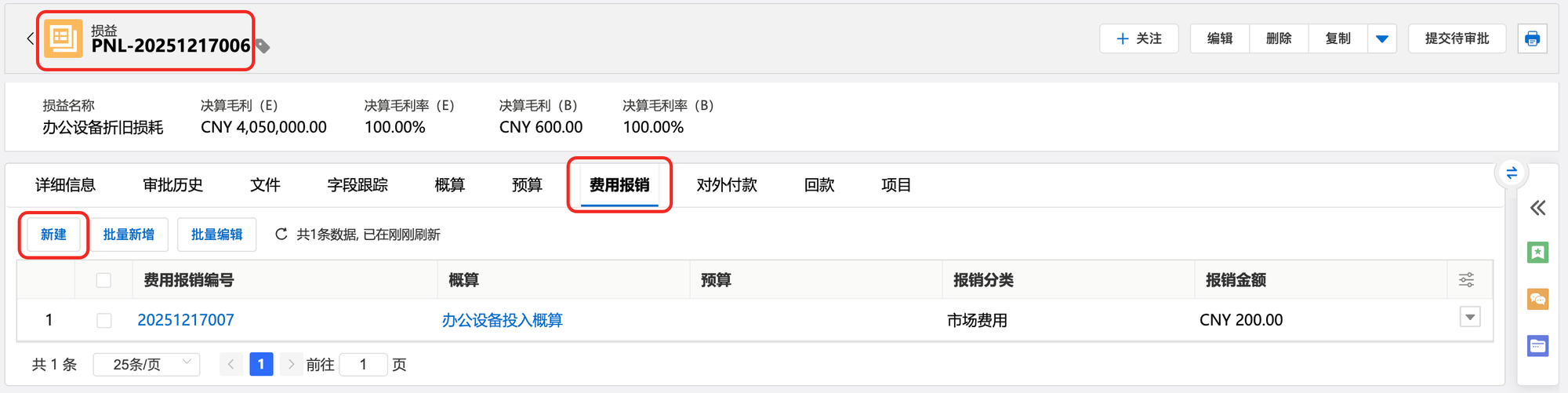 d)损益详情页,定位至费用报销相关列表,点击新建。