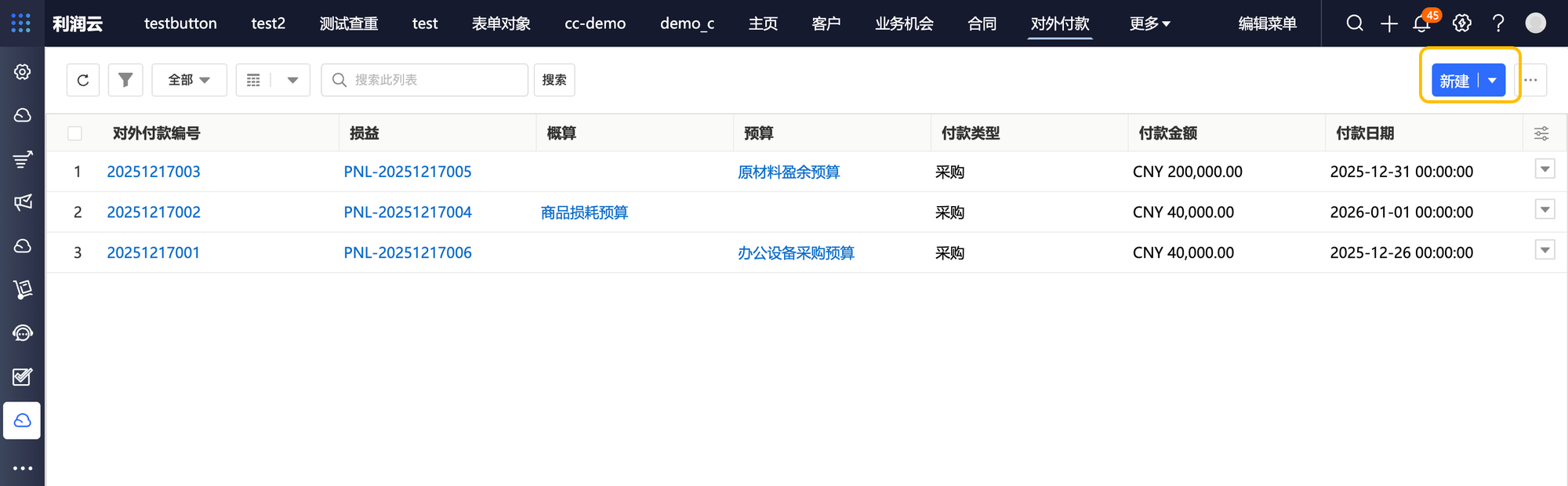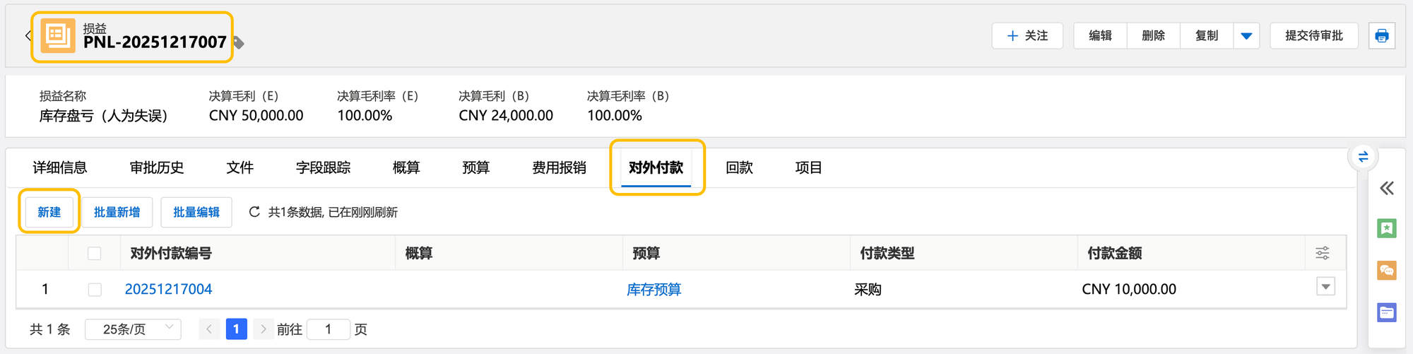 d)损益详情页,定位至对外付款相关列表,点击新建。