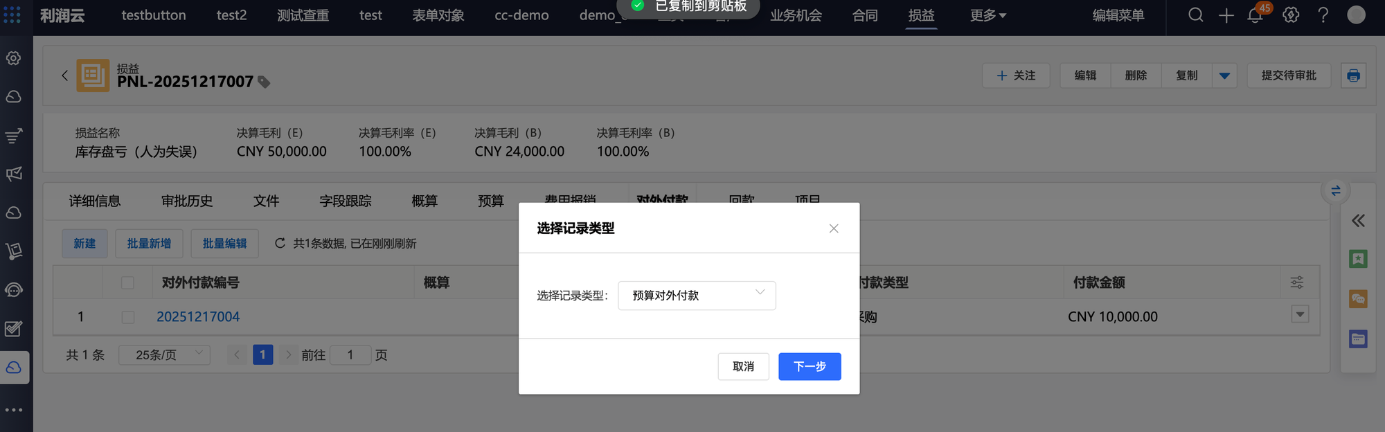 3. 选择关联的概算记录,损益记录,选择对外付款类型,输入报销金额。