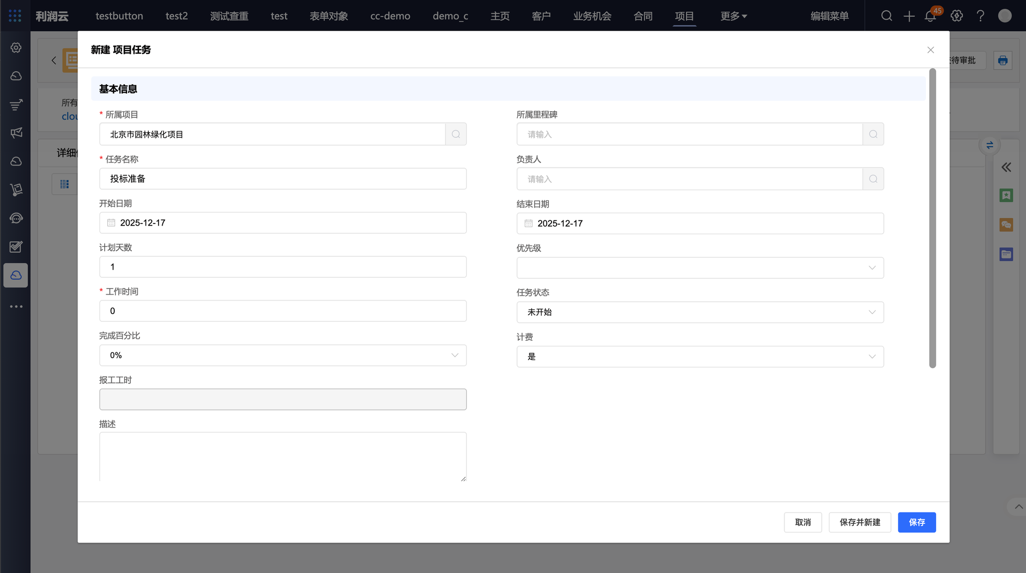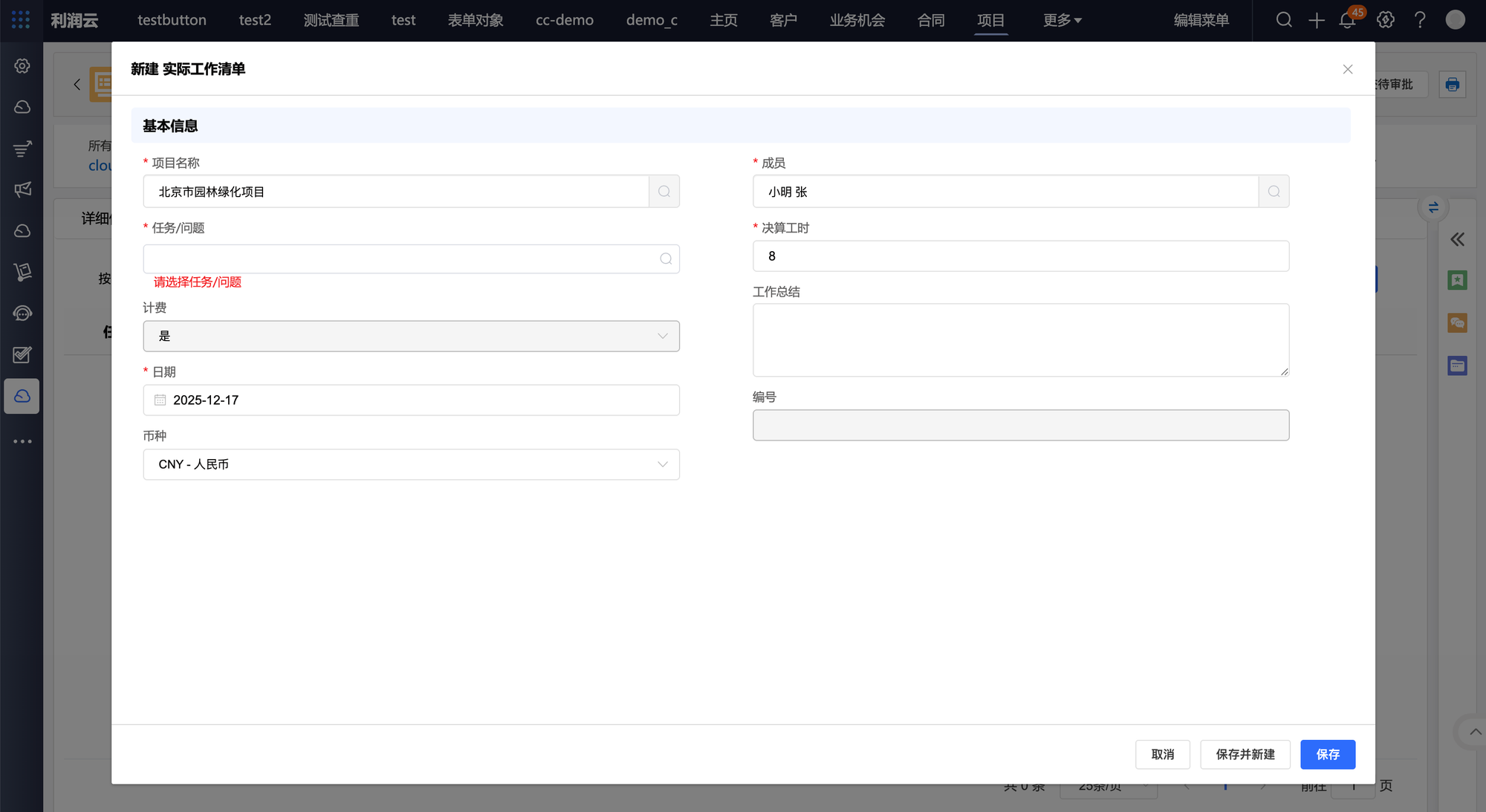 3:项目详情页新建项目任务、实际工作清单。