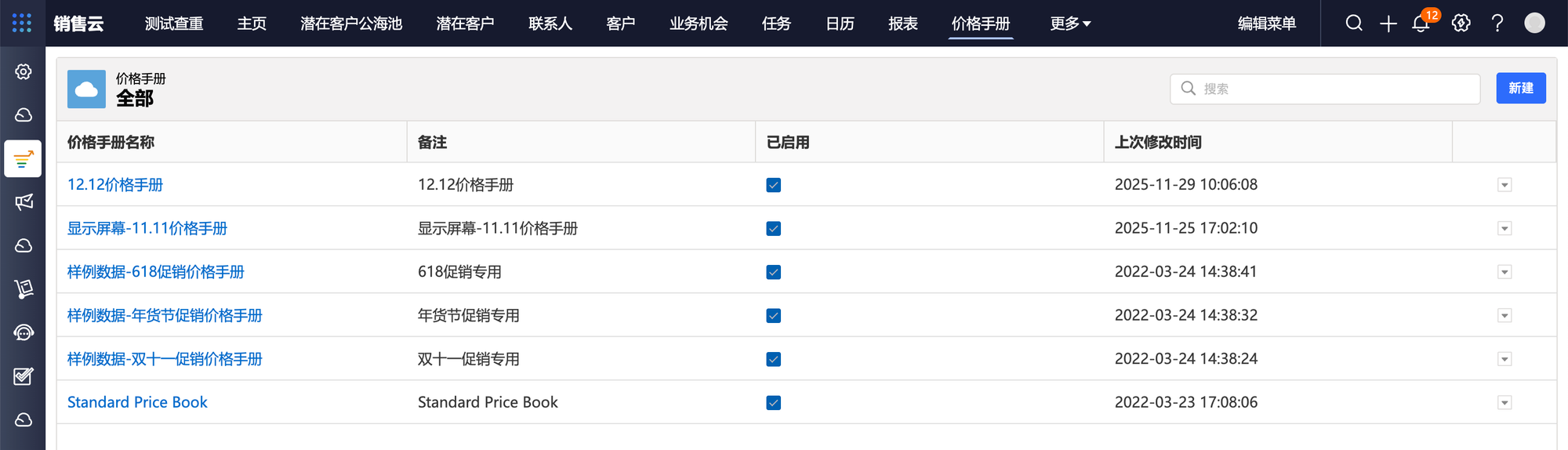 系统将根据产品目录预置一个标准价格手册,该标准价格手册包含所有产品及其价格。在产品页面新增产品时,标准价格手册会自动同步产品信息和价格。