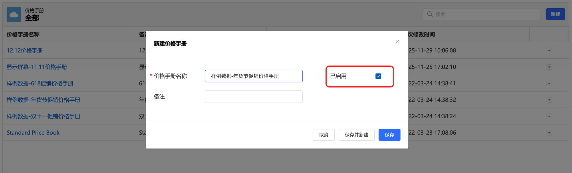 2.在价格手册编辑页面,填写价格手册名称。如果在报价时希望添加某一价格手册下的产品,则勾选“已启用”复选框以启用该价格手册。点击“保存”,完成价格手册创建。