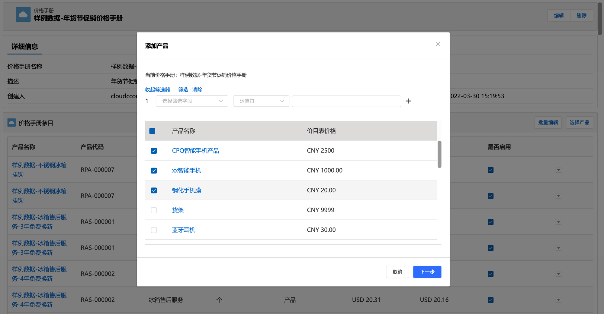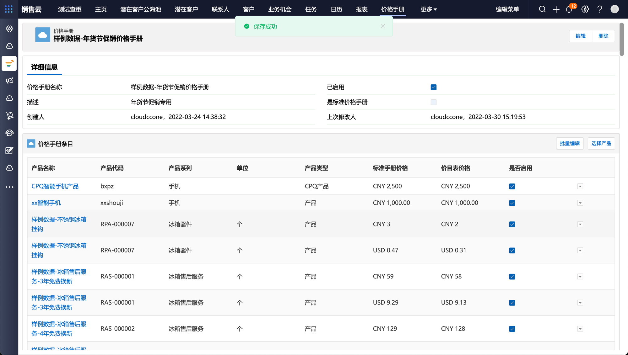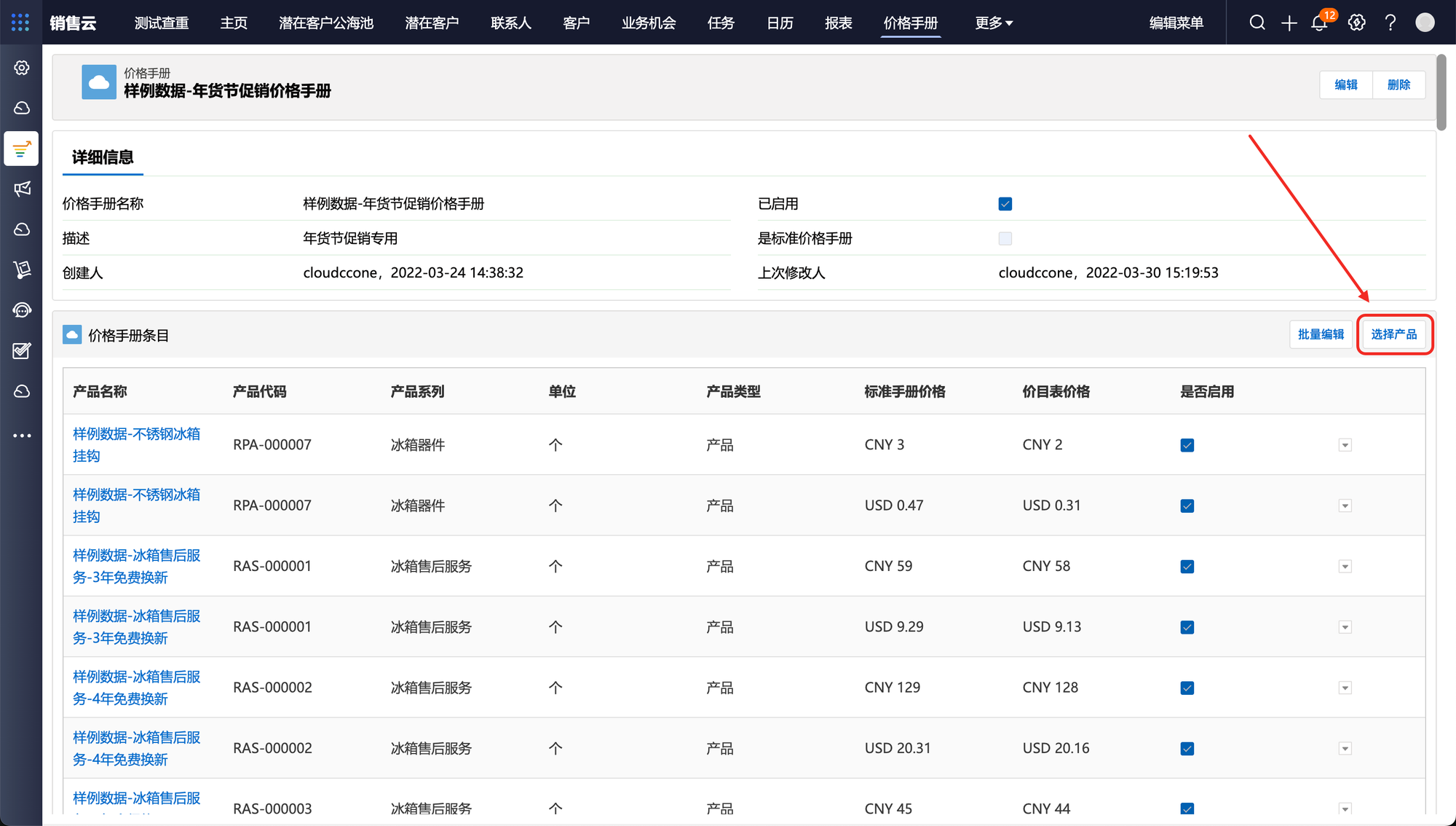 创建好价格手册后,销售可在单个价格手册下添加价格手册产品,并可根据不同客户或促销场景对价格手册中的产品重新定价。