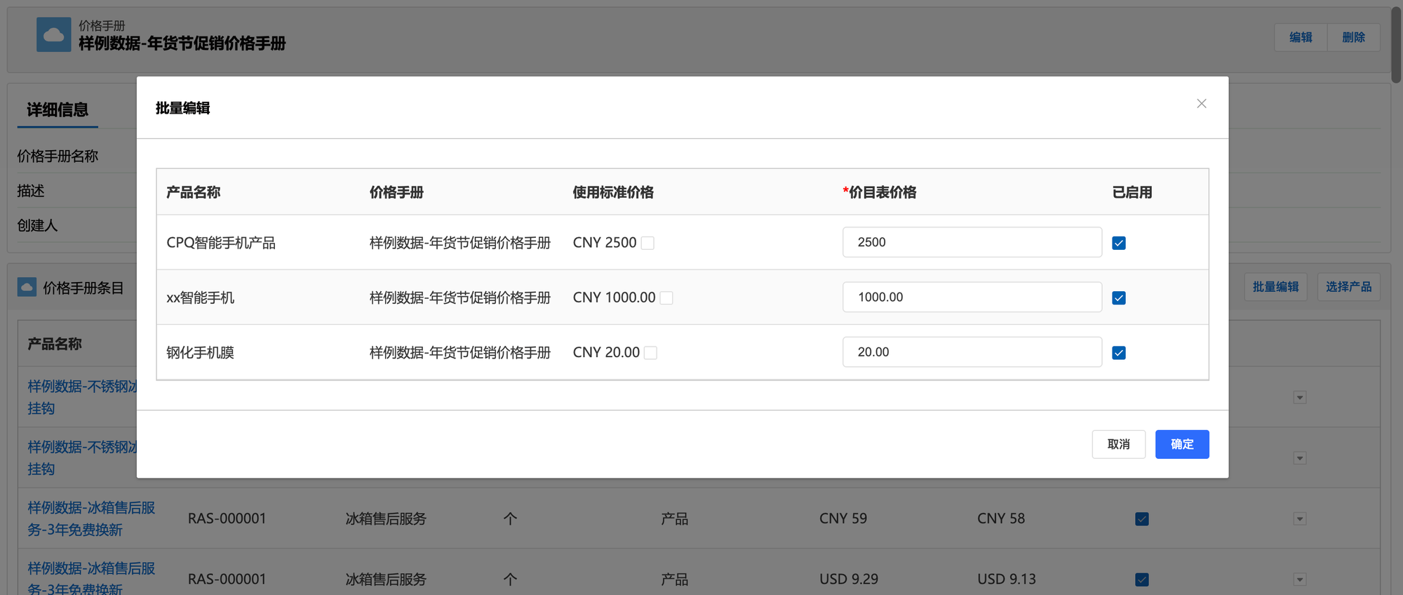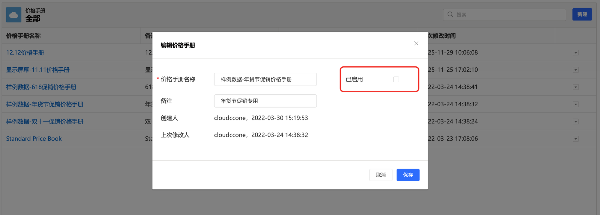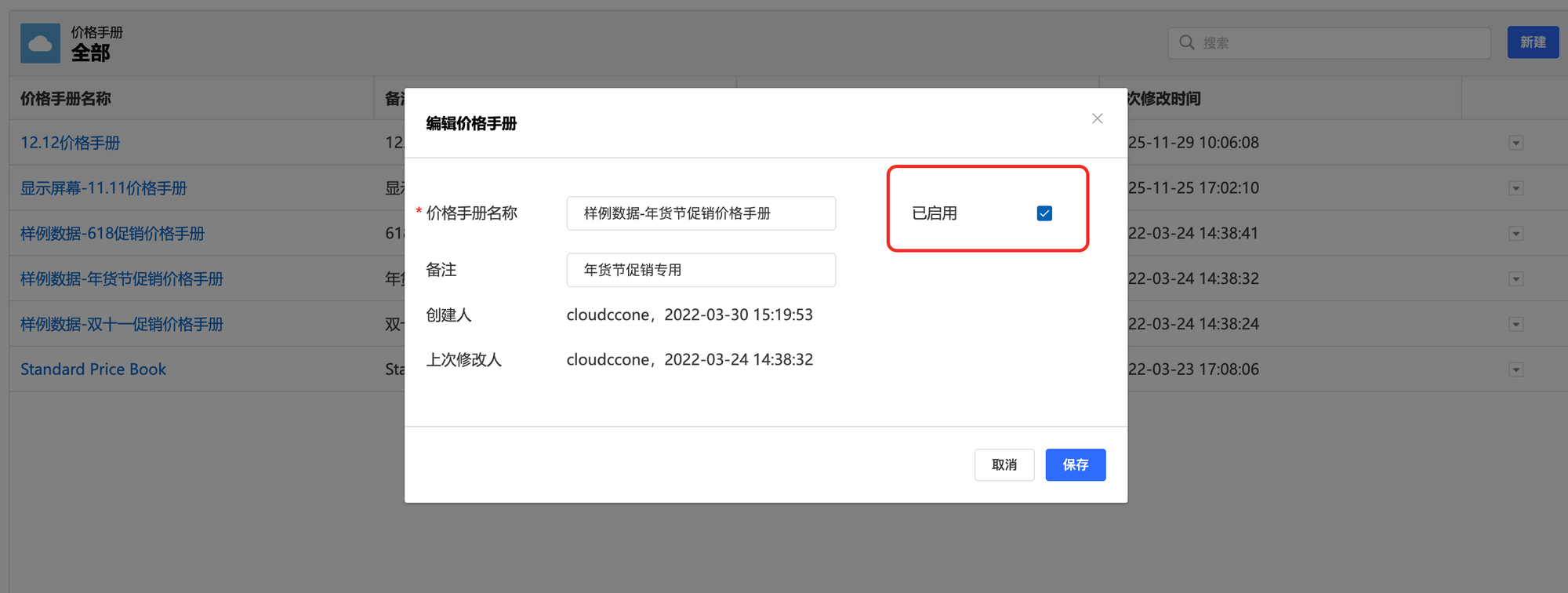 在单个价格手册详情页勾选“已启用”复选框,即可启用价格手册。