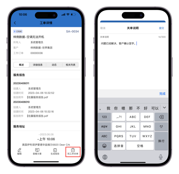 步骤1:登录APP,我的工单>工单详情页,点击“完工并关单”按钮。