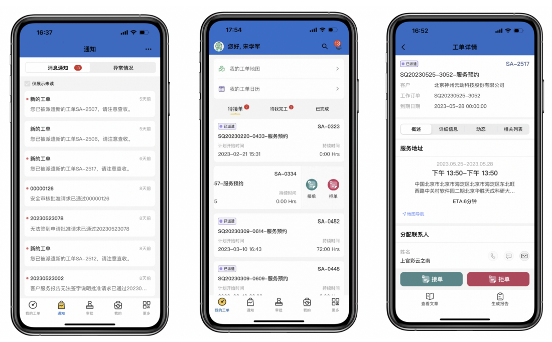 步骤1:调度员派工后,现场服务人员则会收到派工通知。通过点击通知则可以直接进入到“被派遣工单”的详细信息 页面查看。