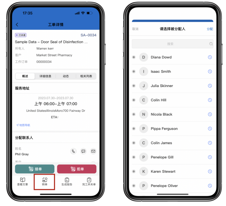 步骤3:服务人员不仅可以接单、拒单,也可以进行转单。系统管理人员可以将“转单”按钮配置到详情页上,服务人员点击“转单”按钮后,则会显示“可被转单的人员列表”,选择某个人员后,点击右上角“分配”,则转单成功。被转单人可收到转单消息后仍需要进行接单、拒单的操作。