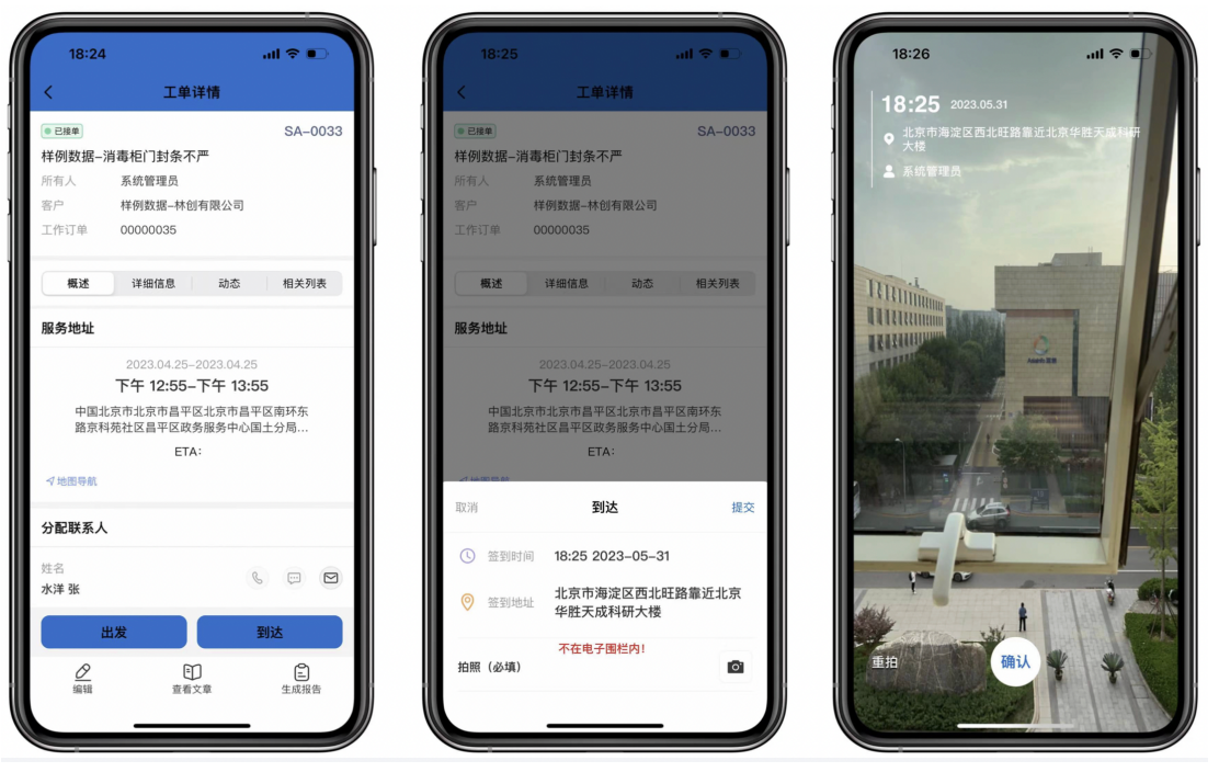 步骤1:接单后,现场服务人员需点击“出发”签到,到达客户现场后需点击“到达”签到,两次签到过程,系统会自动记录2次签到的时间和位置。