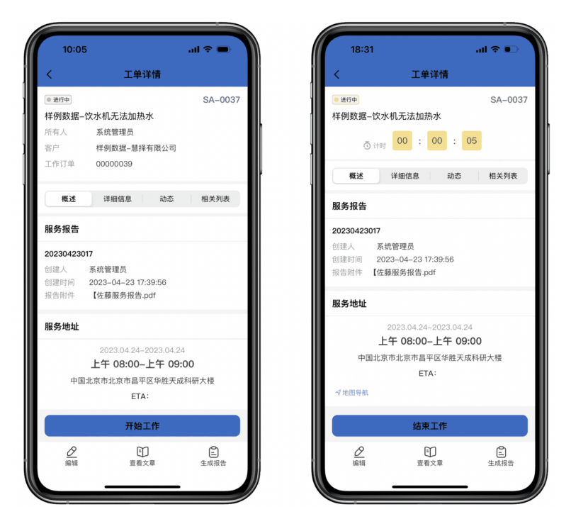 步骤3:现场签到后,为了方便管理服务人员在现场工作的时间,服务人员可以通过“开始工作”和“结束工作”计时工作时长。