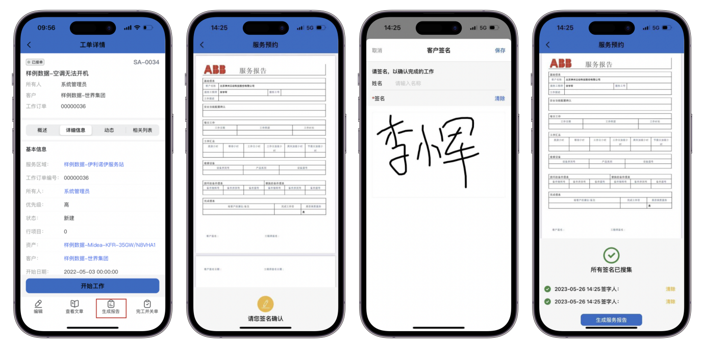 步骤3:预览服务报告内容,检查无误后,点击“请您签名确认”,手势签名后点击右上角“保存”。
