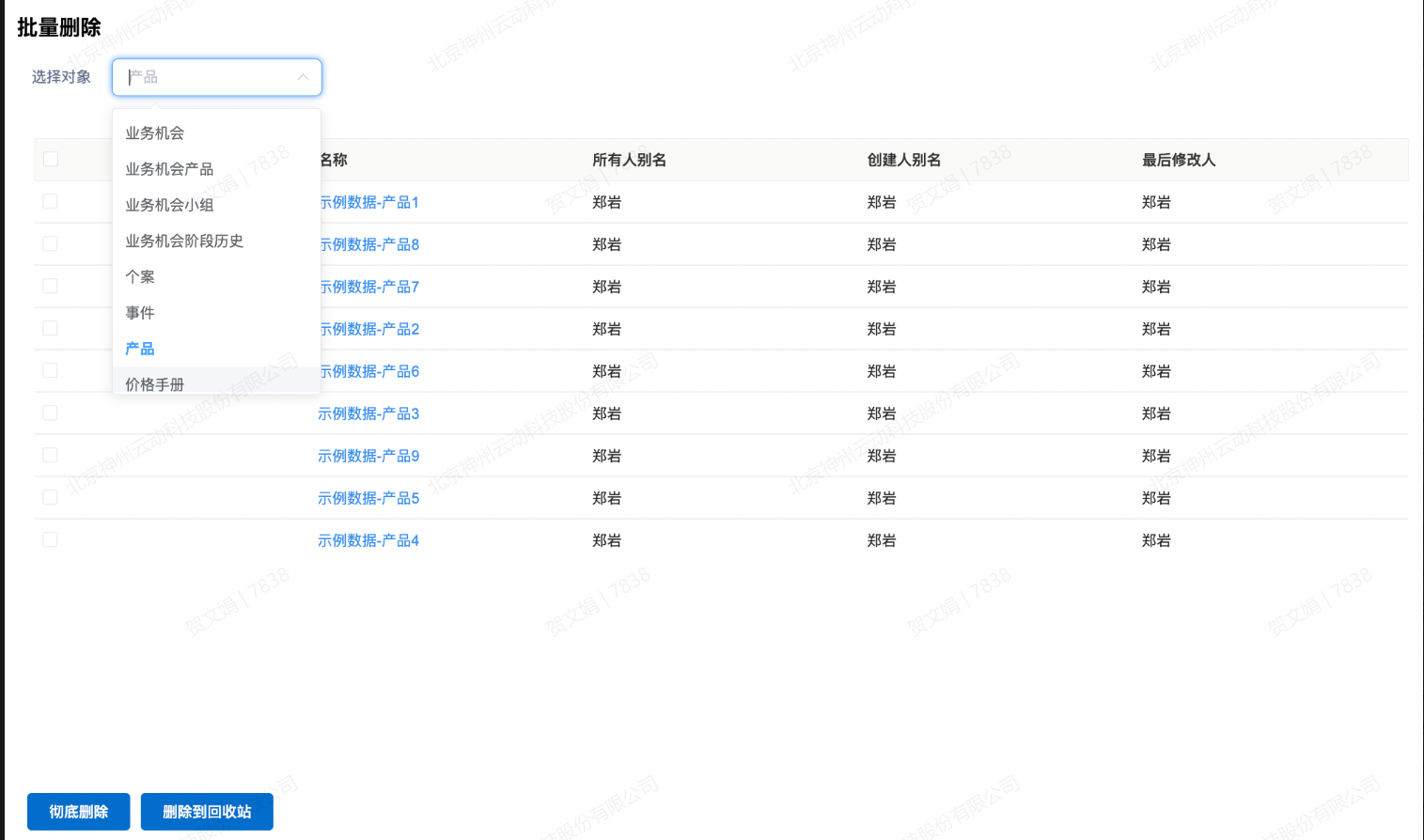 数据管理 批量删除 平台为方便用户快速删除过期或无用的数据,提供了批量删除的功能。操作步骤选择目标对象,选定要删除的记录点击“彻底删除”或“删除到回收站”按钮,完成数据批量删除注意:彻底删除是从数据库直接删除,不再留存在数据库;删除到回收站是将数据记录放到回收站,用户可从回收站恢复数据。 Previous Next