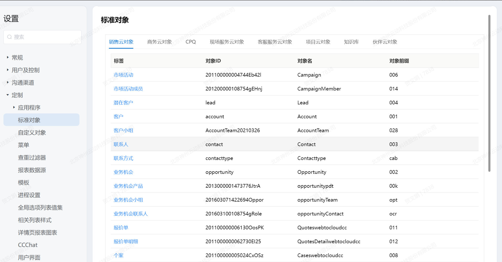 标准对象是基于销售自动化的CloudCC CRM应用程序提供的具有默认功能的对象。 标准对象不可删除,名称不可编辑,标准对象其他属性均可自定义维护。