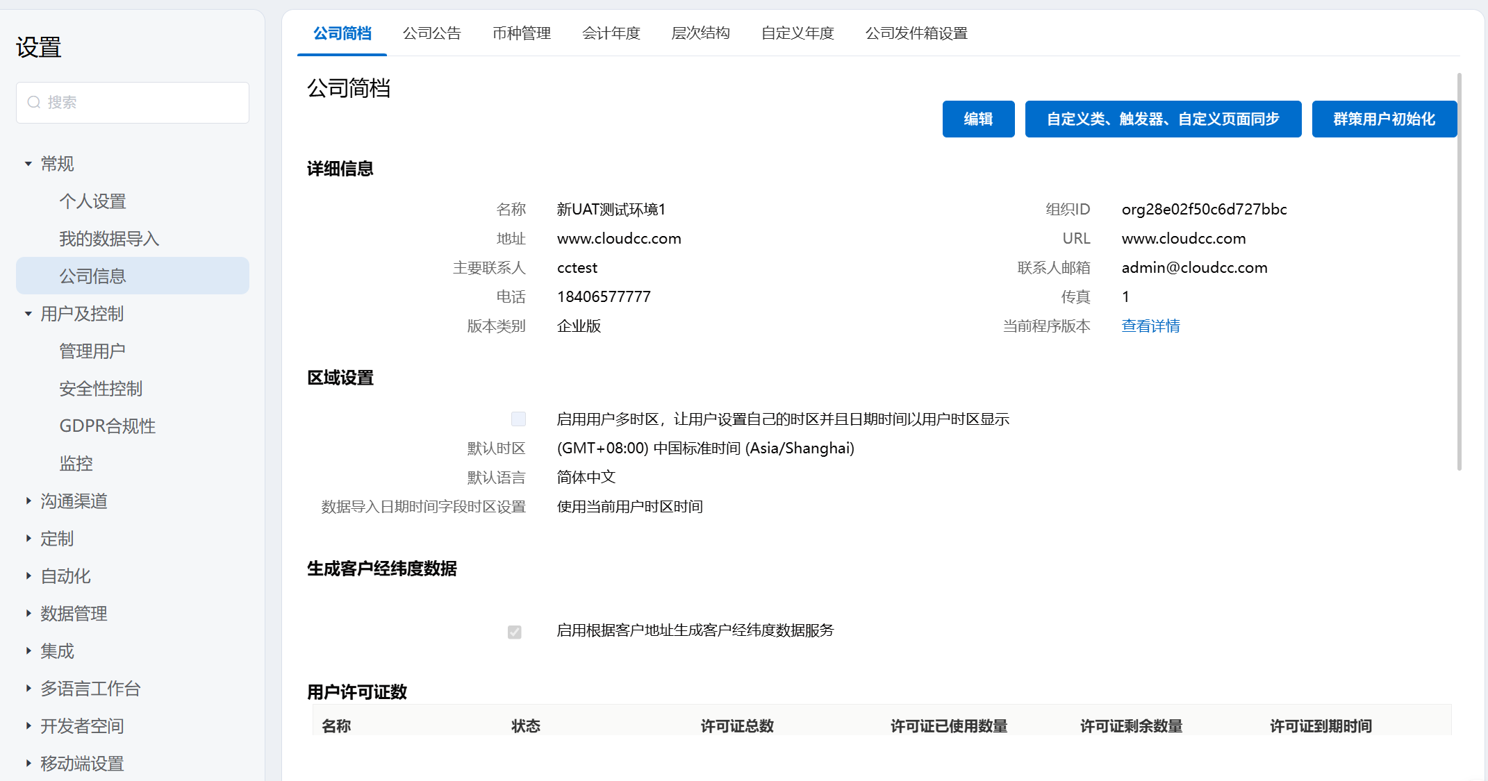 该模板统一展示了当前组织的详细信息、公司时区/币种/语言等基本信息,以及展示当前用户许可证数/功能许可证数。